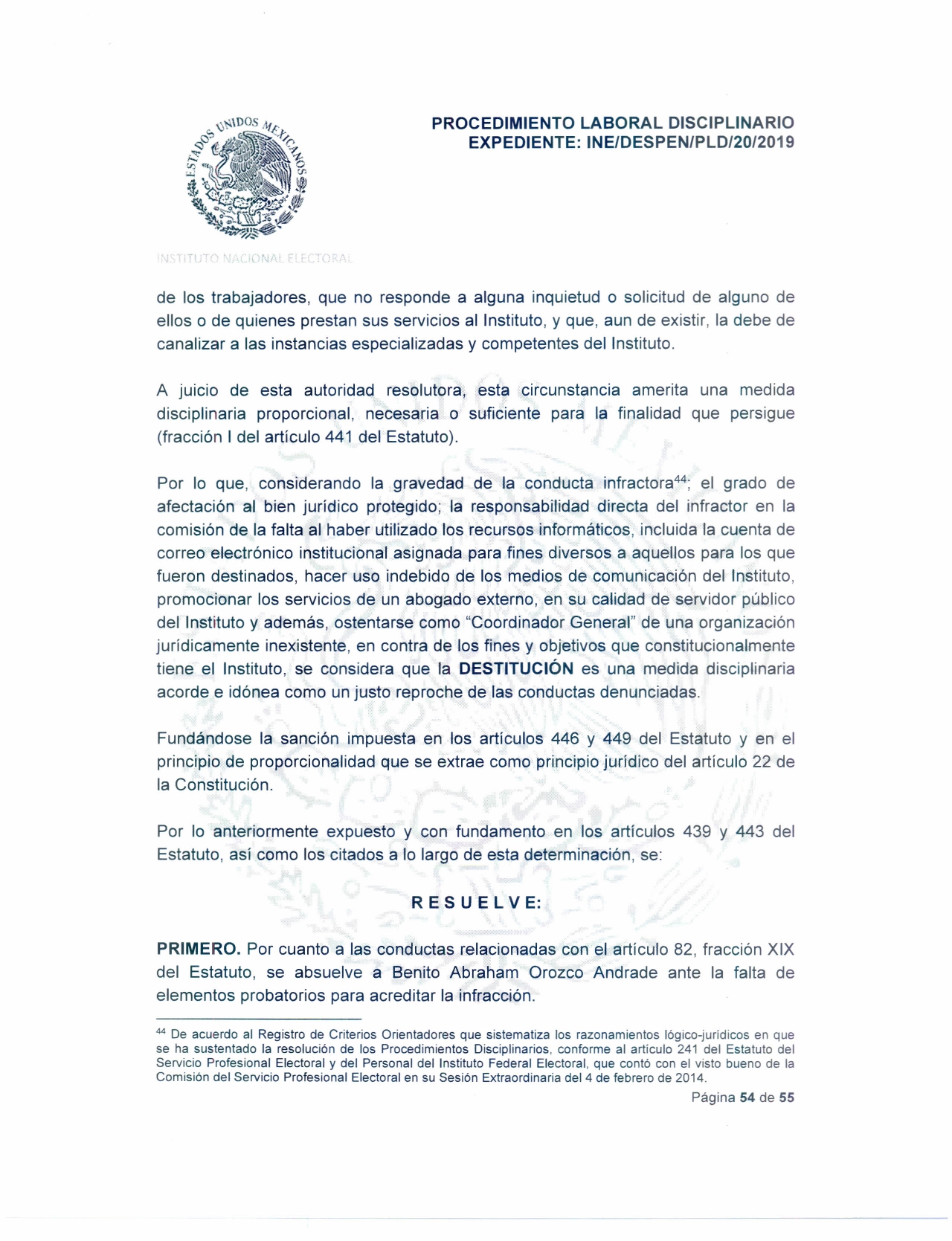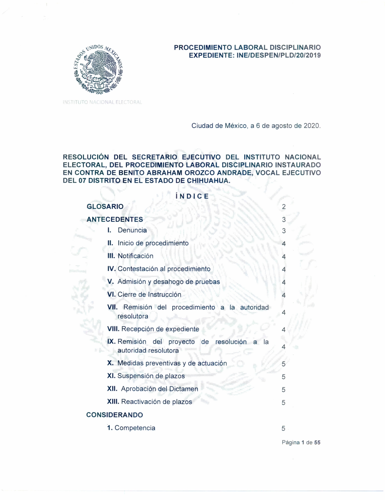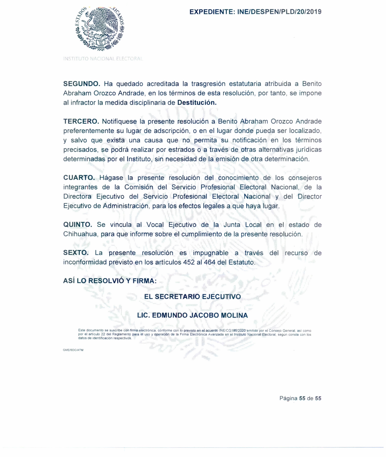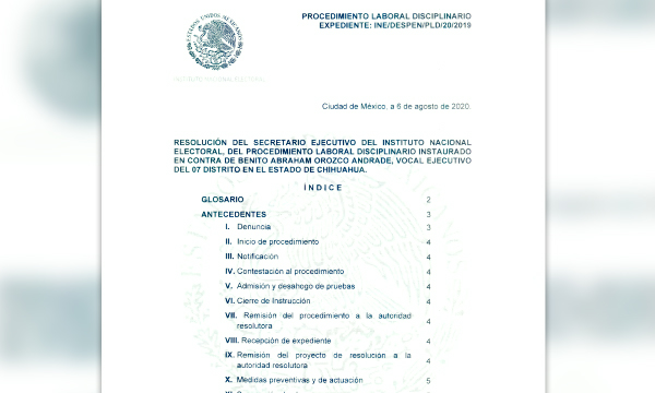 El secretario Ejecutivo del Instituto Nacional Electoral (INE), Edmundo Jacobo Molina, determinó destituir a Benito Abraham Orozco Andrade de su cargo como vocal Ejecutivo de la 07 Junta Distrital Ejecutiva del INE en Chihuahua, quien en noviembre del año pasado había denunciado abusos en contra de los trabajadores de esa institución.