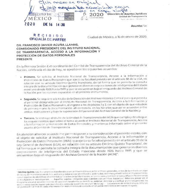 La entrevista de Contralínea con Ruiz Abreu se realizó antes de que el AGN solicitara al Inai que emitiera una declaratoria de interés público para la información de la DFS y la DGIPS. El jueves pasado (16 de enero) el Archivo solicitó al organismo autónomo la declaratoria con el objetivo de posibilitar la consulta íntegra de los documentos señalados.