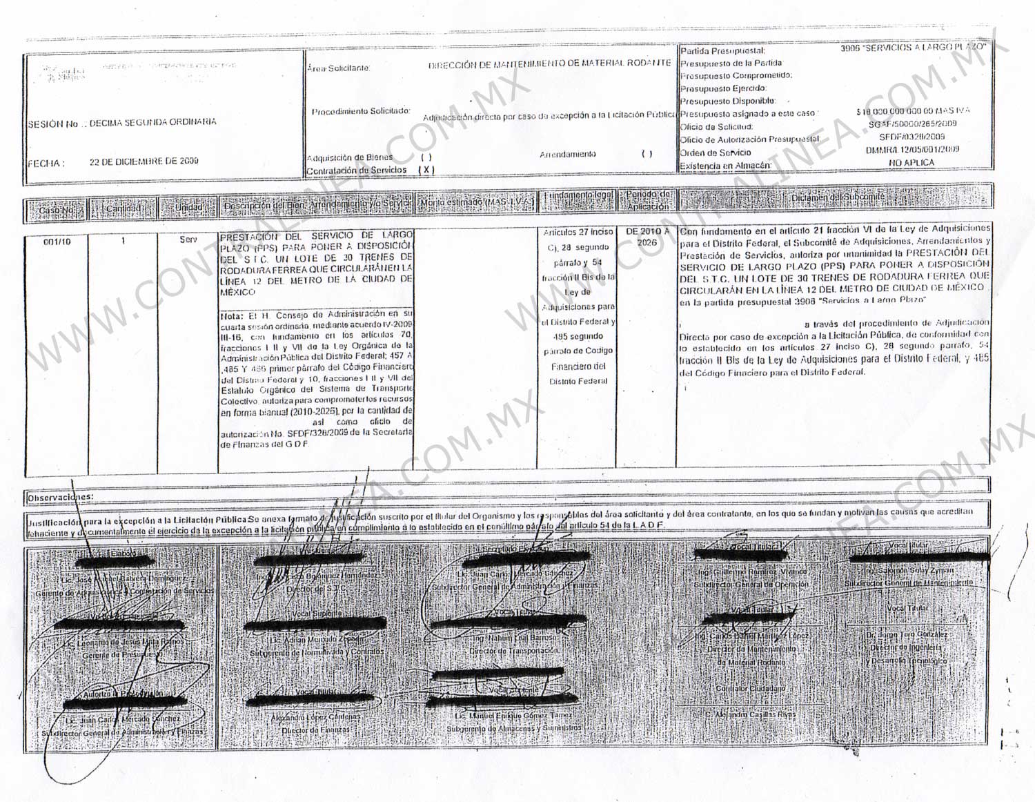De acuerdo con el acta de la Décima Segunda Sesión Ordinaria 2009 del Subcomité de Adquisiciones, Arrendamiento y Prestación de Servicios del STC, los 19 funcionarios que integraban el órgano dependiente del STC autorizaron, por unanimidad, el Proyecto para la Prestación de Servicios (PPS) de largo plazo para poner a disposición del SCT un lote de 30 trenes de rodadura férrea que circularían por la Línea 12 del Metro de la Ciudad de México. El documento está fechado el 22 de diciembre de 2009.