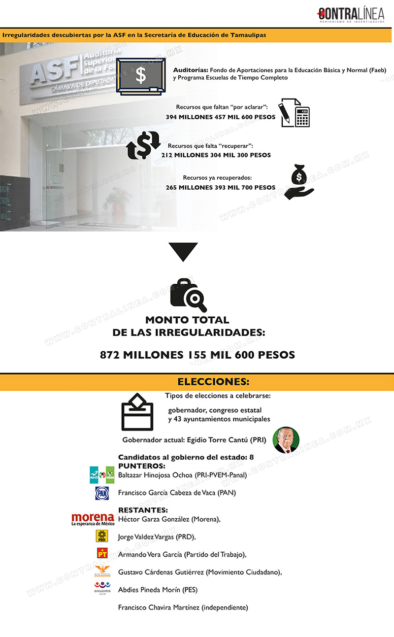 La Auditoría Superior de la Federación (ASF) descubre en el estado de Tamaulipas irregularidades en el manejo de recursos públicos por más de 872 millones 155 mil 600 pesos. El monto corresponde sólo a dos de las revisiones del uso del dinero entregado por la Federación en 2014 al gobierno del estado, encabezado por el priísta Egidio Torre Cantú.