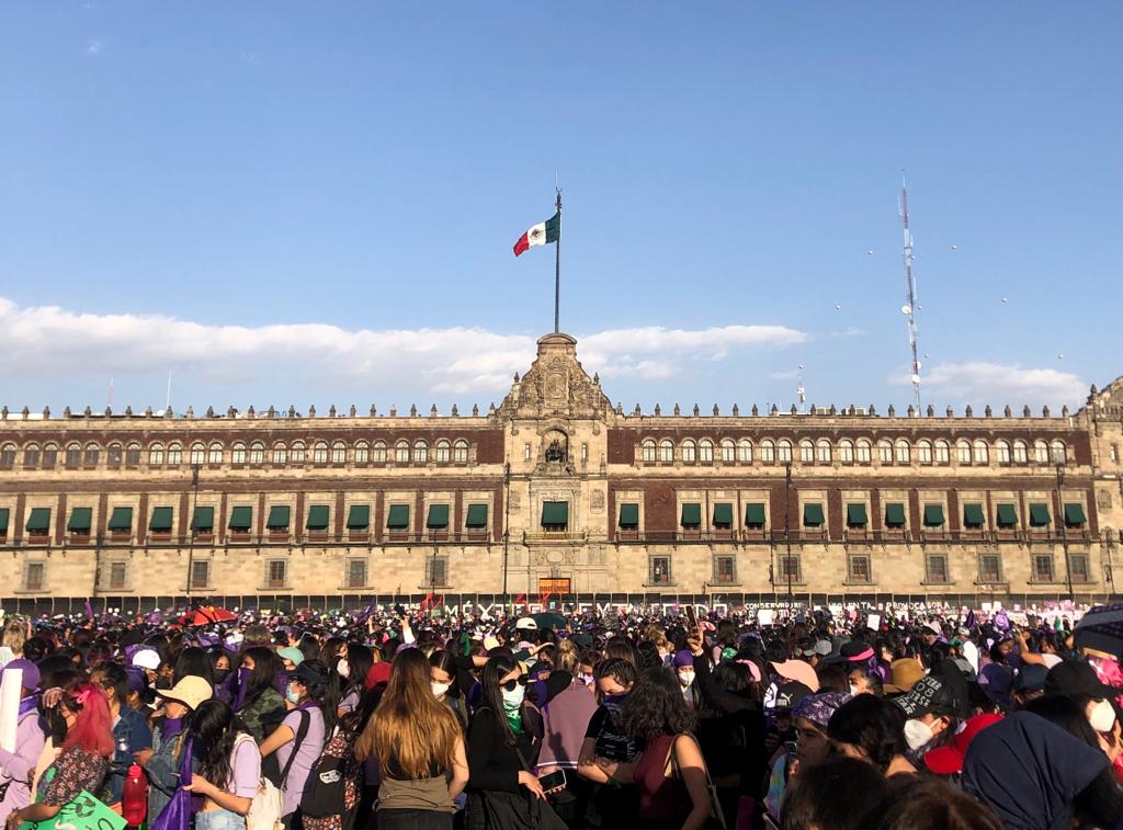 Después de las 17 horas ya se veían a miles de mujeres en la plancha del Zócalo. Una bocina comenzó a sonar el que ya se ha hecho himno feminista, la Canción Sin Miedo: “Por todas las compas marchando en Reforma. Por todas las morras peleando en Sonora. Por las comandantas luchando por Chiapas Por todas las madres buscando en Tijuana. Cantamos sin miedo, pedimos justicia. Gritamos por cada desaparecida. Que resuene fuerte: ¡Nos queremos vivas! ¡Que caiga con fuerza el feminicida!” coreaban las asistentes a esta manifestación del 8M.