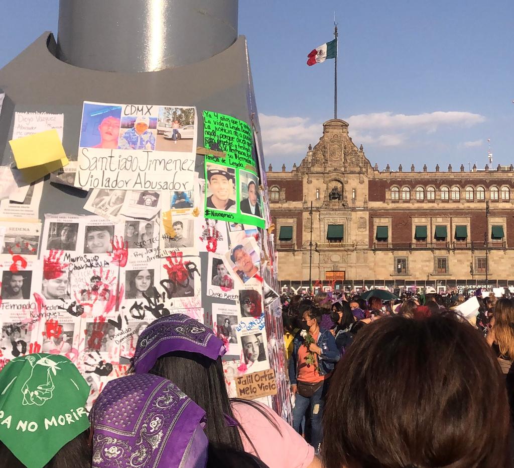 En la base del asta bandera, las fotos de quienes han sido acusados de abuso sexual, violación, pedofilia, acoso, feminicidio. La más grande de las pintas se plasmó sobre la plancha del primer cuadro de la Ciudad: “No tenemos miedo, tenemos fuego”.