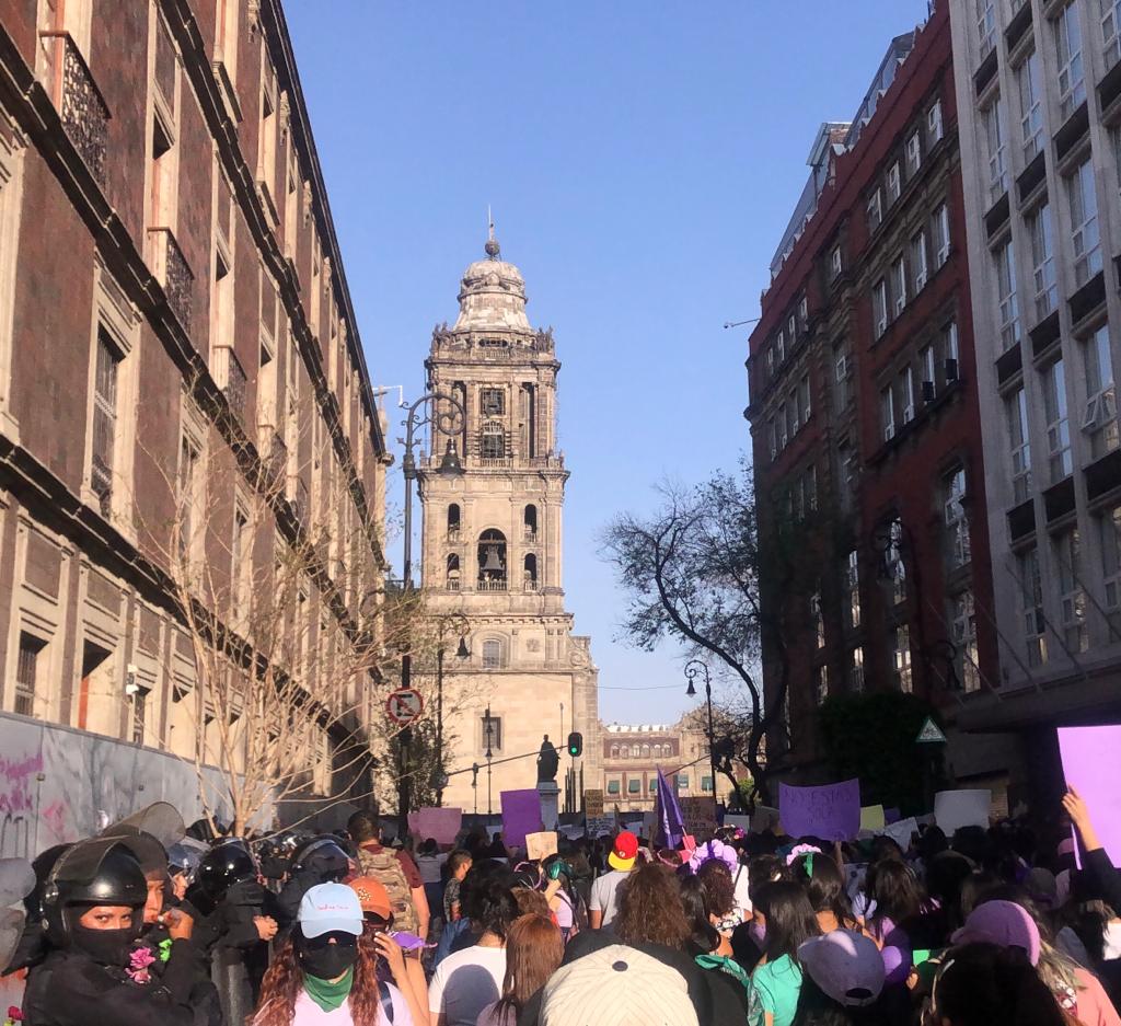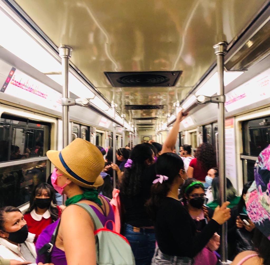 Los vagones rosas de las líneas 1, 2 y 3 del metro se colmaron de ellas, quienes cargaban pancartas y se comunicaban para acordar su llegada, se cuidaban. Sobre avenida Reforma, una de las principales de la capital del país, ya había contingentes a la espera. La ola morada cubría las calles del primer cuadro de la Ciudad de México, gobernada por una mujer.