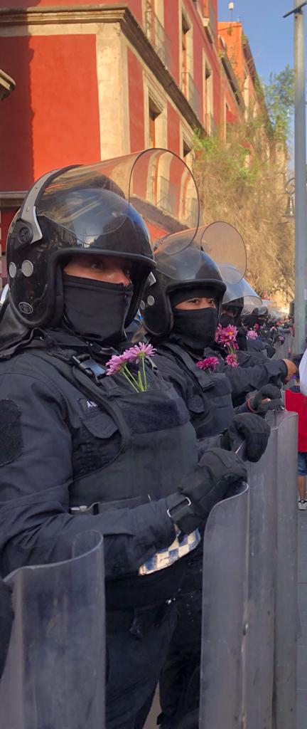 Recibían las flores que otras mujeres, integrantes del colectivo Mujeres en Resistencia Pacífica. Avanzaban conforme lo hacían los contingentes, frente al Palacio de Bellas Artes. Otras, ya custodiaban los alrededores del Banco de México y la calle de 5 de Mayo, por donde caminaban los contingentes femeninos. La marcha transcurría sin disturbios.