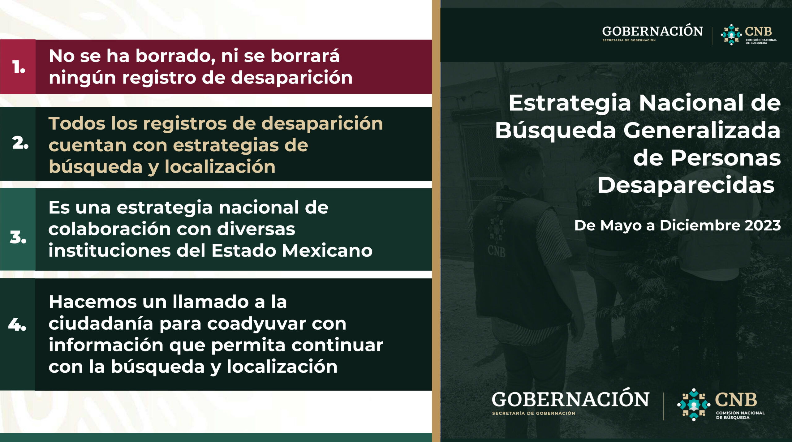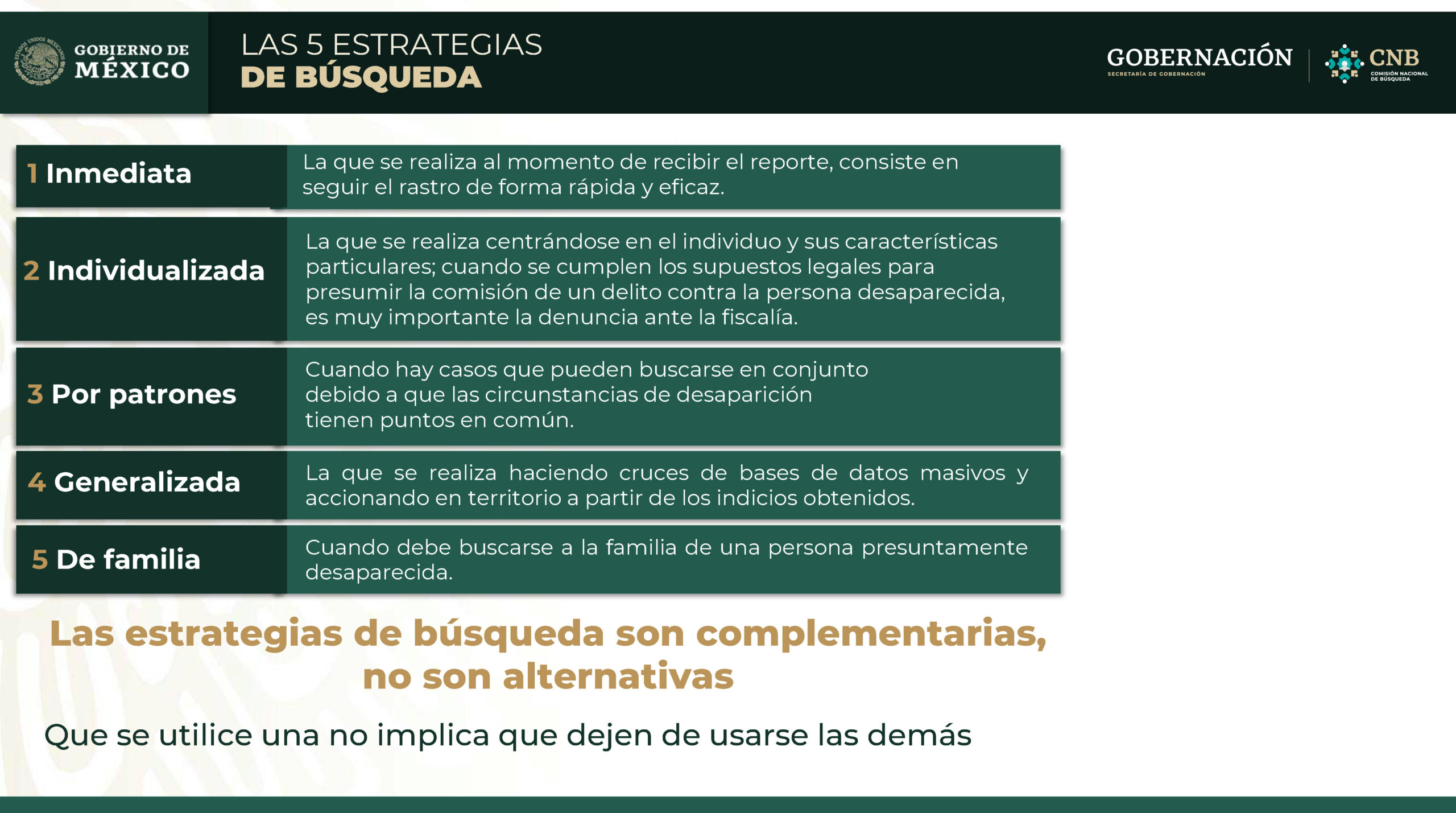 Aclaró que la Estrategia Nacional de Búsqueda Generalizada “es tan sólo una de las cinco estrategias de búsqueda que lleva a cabo el Gobierno de México”. Las cinco están definidas en el Protocolo Homologado para la Búsqueda de Personas Desaparecidas y No Localizadas.