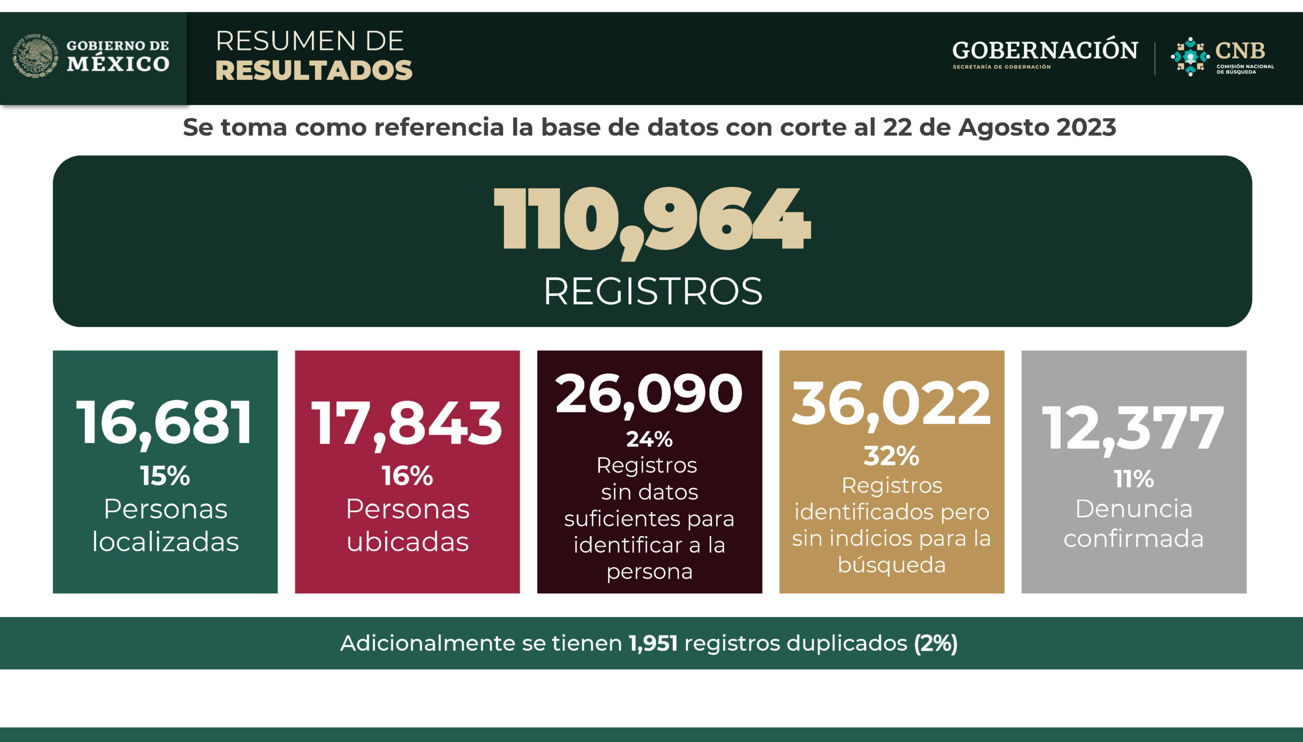 Nadie ha sido borrado de la base de datos que, con corte al 22 de agosto pasado, suman 110 mil 964 registros, aclaró Luisa María Alcalde Luján, titular de la Segob. Se detalló que, de ese total, 16 mil 681, el 15 por ciento, corresponde a personas ya localizadas. Otras 17 mil 843, el 16 por ciento, se trata de personas ubicadas, es decir, con indicios de localización.