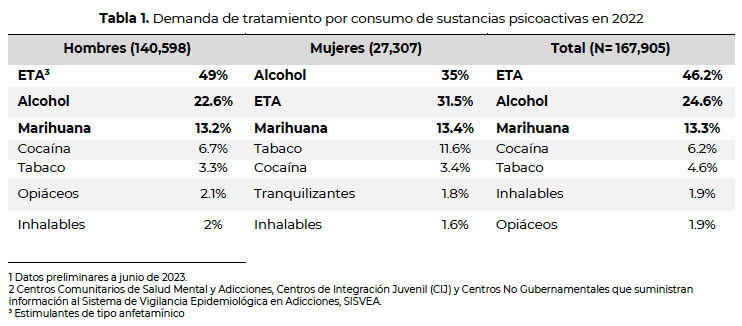 Las sustancias cuyo consumo causó mayor demanda de tratamiento fueron los estimulantes de tipo anfetamínico (ETA) –que incluyen anfetaminas, metanfetaminas, éxtasis o estimulantes de uso médico–, con el 46.2 por ciento de los casos; seguidos del alcohol, con el 24.6 por ciento; y la marihuana, con el 13.3 por ciento.