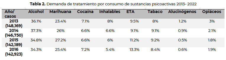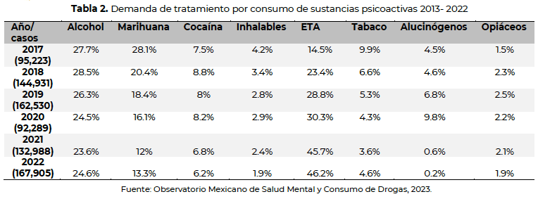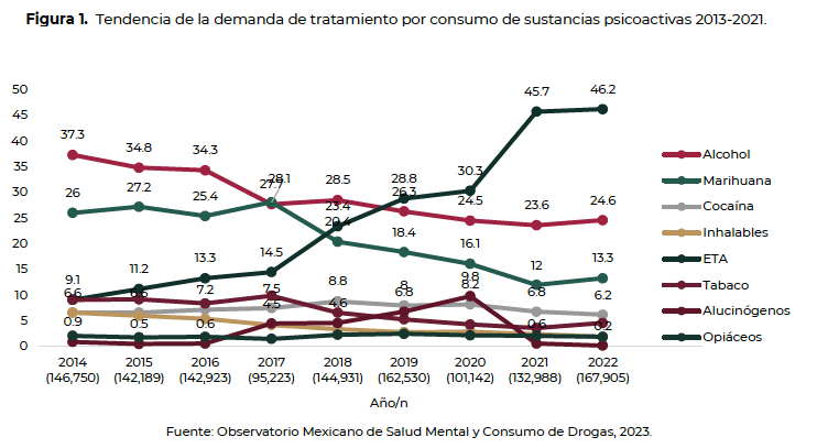 El Observatorio sostiene que, considerando los últimos cinco años (de 2017 a 2022), es posible identificar algunos cambios importantes, por ejemplo, que en ese periodo la demanda de tratamiento por consumo de ETA incrementó en 218 por ciento, y la de alcohol y marihuana disminuyeron 11 y 52 por ciento, respectivamente.