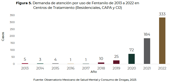 El Observatorio Mexicano de Salud Mental y Consumo de Drogas estima que, si bien los opioides no son de amplio consumo en México, e incluso son de acceso limitado para fines médicos (por ejemplo, en los cuidados paliativos), los fentanilos de producción ilícita son sustancias cuyo uso ha proliferado en mayor medida en ciertas localidades del norte de México.