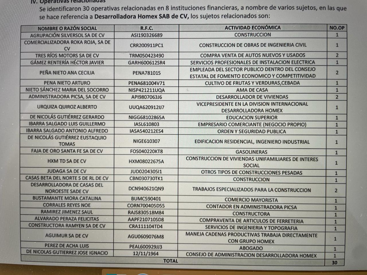 En la gruesa carpeta integrada por la Unidad de Inteligencia Financiera (UIF) en contra del expresidente mexicano y su familia –por los delitos de lavado de dinero, evasión fiscal y enriquecimiento ilícito, y cuya denuncia penal es investigada por la Fiscalía General de la República (FGR)–, se revela que entre 2012 y 2013, Desarrolladora Homex recibió transferencias de recursos por 194 mil 121 millones 630 mil pesos, de los cuales el gobierno del Estado de México, cuando el mandatario estatal era el expriísta (y hoy integrante del Partido Verde) Eruviel Ávila, le transfirió 305 millones 219 mil 168 pesos a esa constructora, y la empresa Proyectos Inmobiliarios Culiacán le depositó a Homex 114 mil 345 millones 236 mi 693.14 pesos.