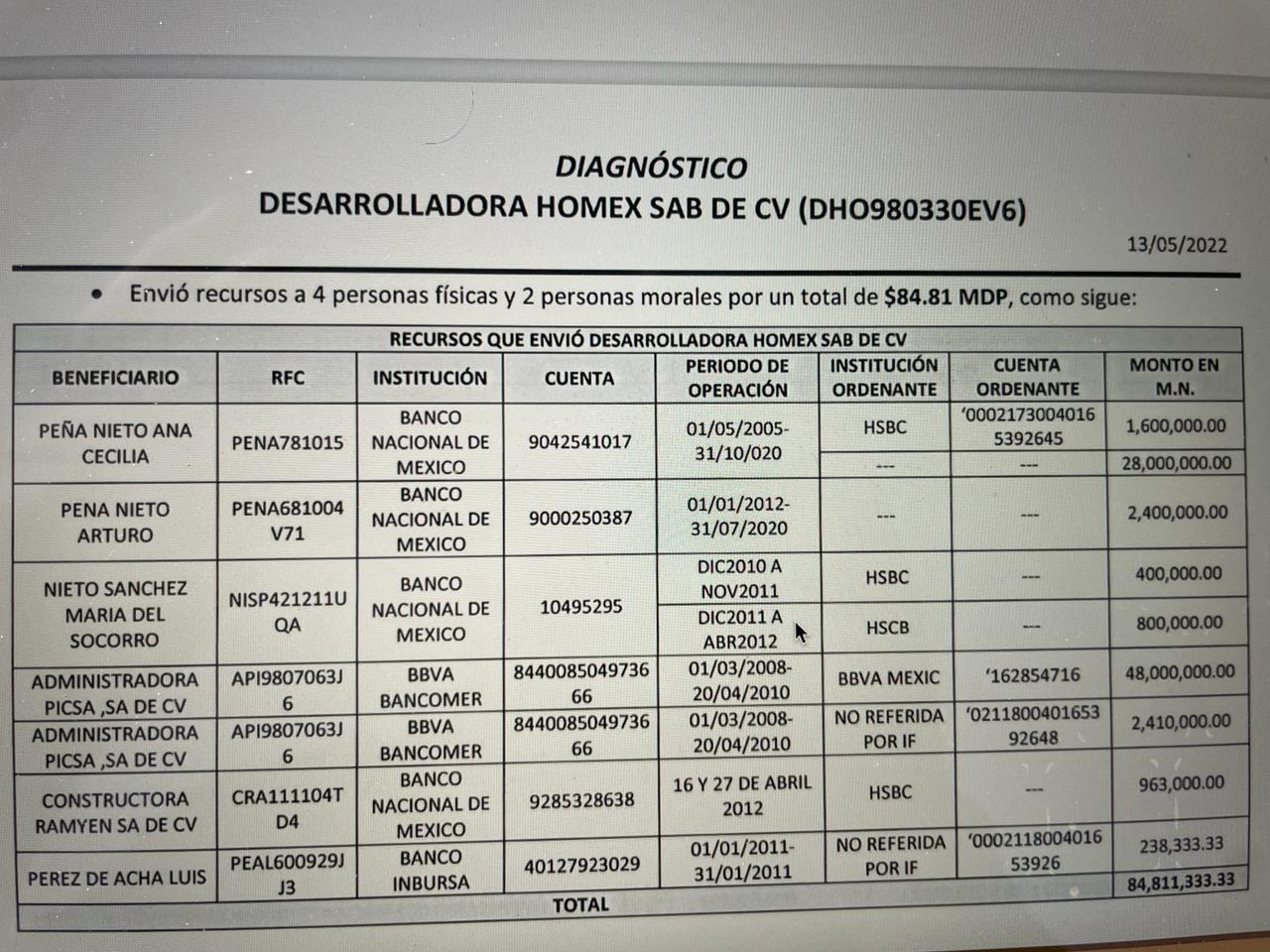 De las transferencias que realizó Homex por órdenes de Eustaquio de Nicolás a la madre de Peña Nieto hay registros bancarios de varios depósitos, el más reciente es por 38 millones, y otro de 2012 por 1 millón 200 mil pesos; mientras que a la hermanos del expresidente priísta, Ana Cecilia Peña Nieto, la desarrolladora inmobiliaria consentida de Peña le transfirió 29 millones 600 mil pesos entre el 1 de mayo de 2005 y el 31 de octubre de 2020; y a su otro hermano, Arturo Peña Nieto, le depositó 2 millones 400 mil pesos.