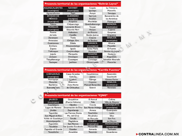El control territorial del país lo encabeza el Cártel del Pacífico, con cobertura en 14 estados y 145 municipios, de acuerdo con el documento de inteligencia. Es seguido por los Caballeros Templarios (con 13 estados y 103 municipios); Los Zetas (11 y 159); la Familia Michoacana, en ocho estados y 59 municipios; los Beltrán Leyva (45 y nueve); Jalisco Nueva Generación (cuatro entidades y 40 alcaldías); el Golfo (cuatro y 14); Carrillo Fuentes (dos  y 19), y  Arellano Félix (dos estados y seis alcaldías).