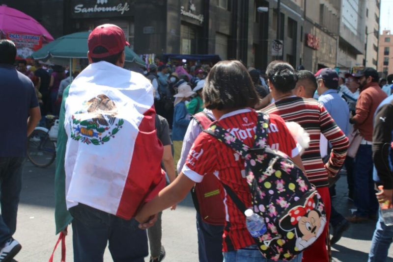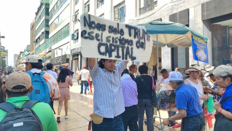Protegido de los rayos de luz con una gorra que bordada con la bandera mexicana, el señor Noé Bravo dice para Contralínea que los aranceles iban a hacer sufrir al país: “implicaría más gastos y se iba a poner más caro” la adquisición de bienes. Por ello, se alegra del actuar de la presidenta: “ha dirigido al pueblo y a la economía bastante bien”.