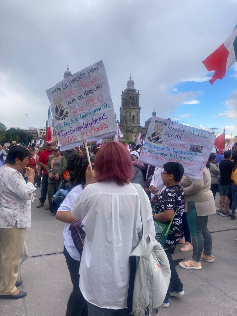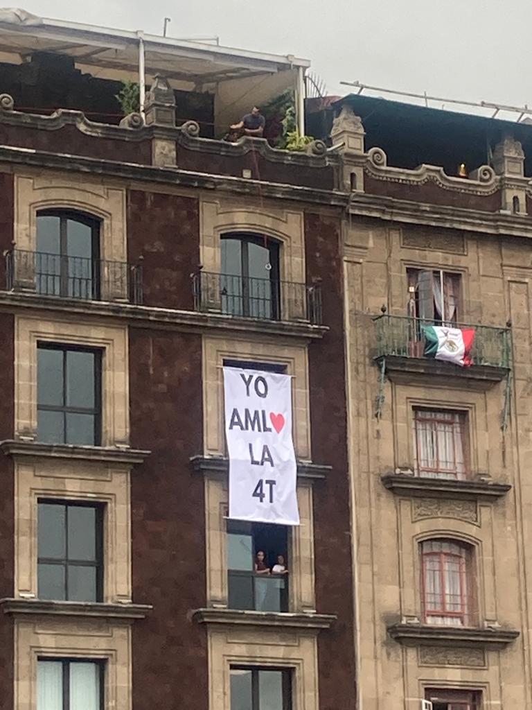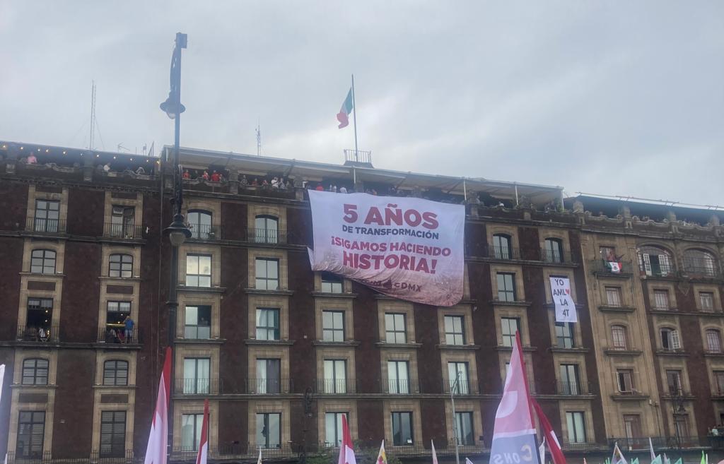 Desde temprana hora inició la celebración del quinto aniversario del triunfo de AMLO, sea en forma de marcha, de baile, de río humano abriéndose paso por las arterias del centro de la Ciudad de México. Ya instalados en el Zócalo, de pie, en bancos, sentados en el piso o en las orillas de las jardineras, miles escuchaban los cánticos de los mariachis. Algunos acompañaban cantando cada melodía.