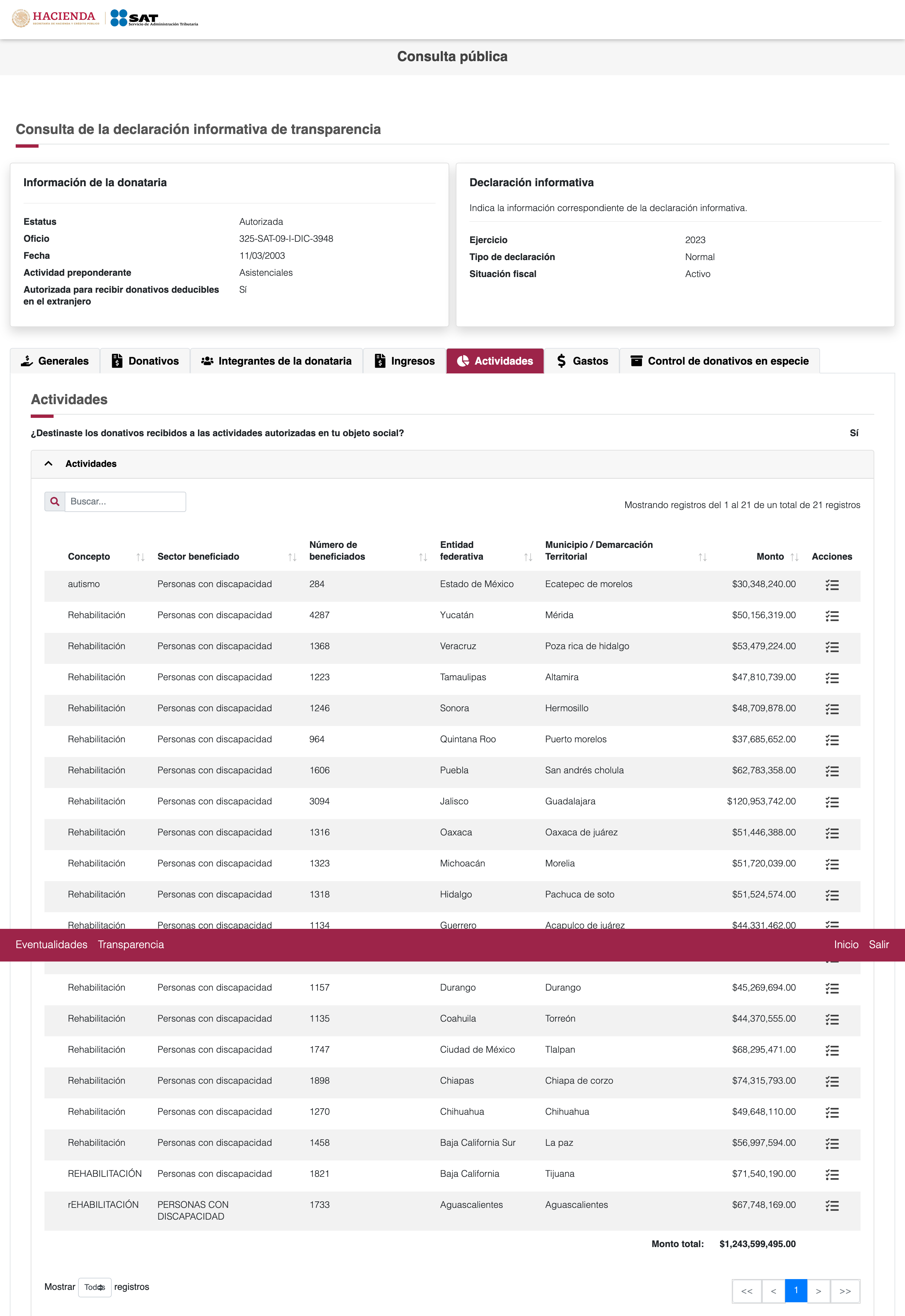 Acerca del destino de los donativos, el informe de la Fundación Teletón al SAT desagrega la población beneficiada por entidad federativa y monto. En total, indica que para atender a las 34 mil 500 personas beneficiarias se destinaron 1 mil 243 millones 599 mil 495 pesos, cifra menor a lo que se invirtió en operaciones especulativas.