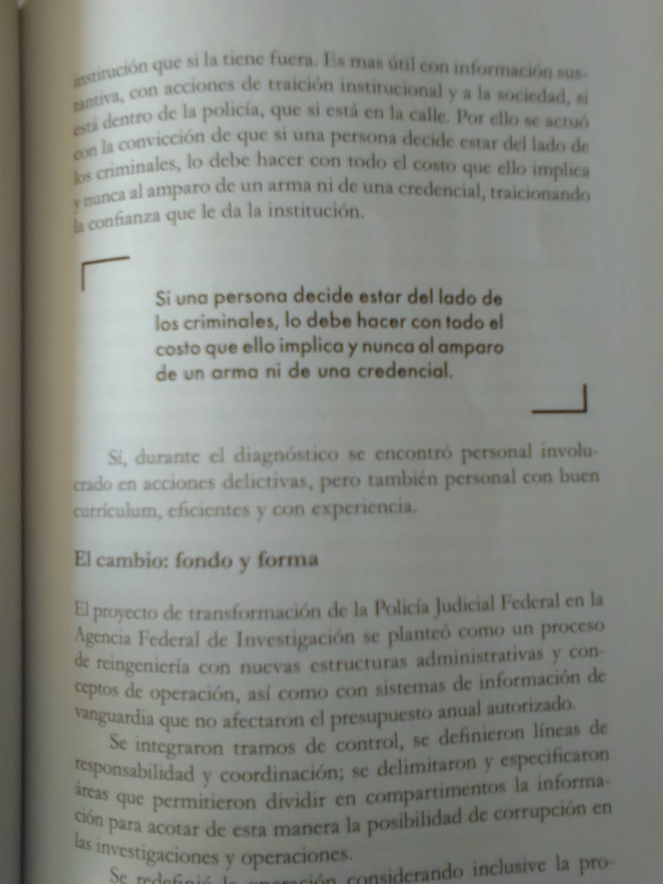 “Sin herramientas reales para combatir al crimen, con una lógica operacional que aceptaba la corrupción como subsidio, el divorcio autoridad sociedad fue la consecuencia natural. Ninguna política en el mundo puede ser eficiente sin el cobijo social”, escribió. Si un gobierno no contó con cobijo social alguno fue el de Felipe Calderón, del que García Luna era el segundo hombre más poderoso.