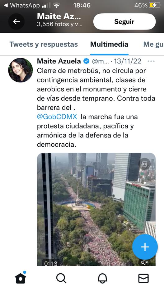 Mientras que en su cuenta de Twitter @maiteazuela, Azuela Gómez escribió: “el INE nos ha dado certezas básicas para confiar en que los que nos gobiernan fueron electos por nosotros, por todas y todos. El INE garantiza los resultados. Destruirlo puede dejarnos sin las certezas más elementales de una democracia. #YoDefiendoLaDemocracia”, 13 de noviembre, 1:38 pm.