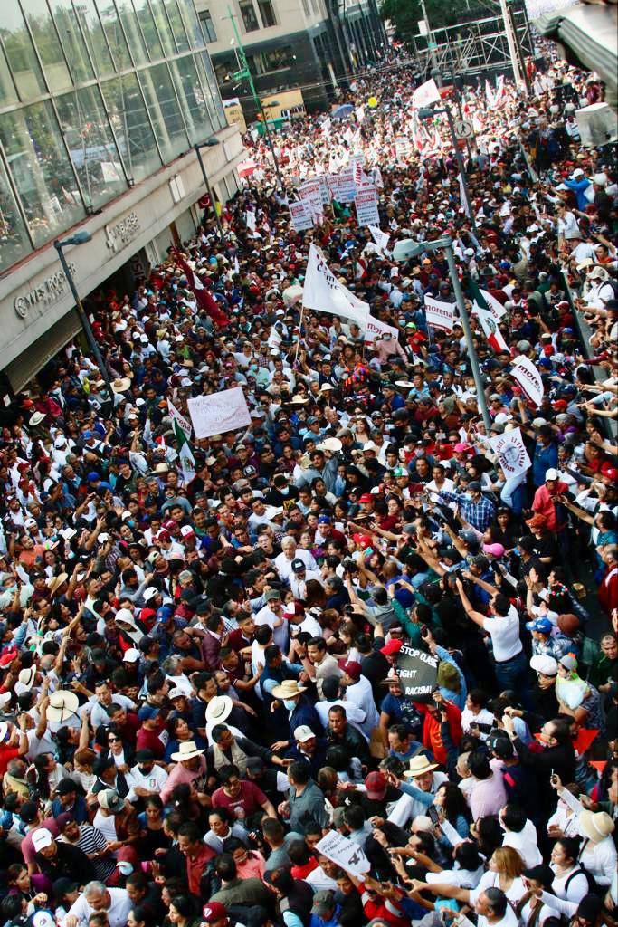 “¡Ahí está mi cabecita de algodón!”, grita una abuela desde las escaleras del edificio del Banco de México. Rompe en llanto al alcanzar a ver a lo lejos, entre tumultos, al hombre de 69 años de edad caminar, sonreír, saludar, dialogar con un pueblo que hoy le refrendó su entrega. El de Tepetitán, Macuspana, Tabasco, guayabera blanca, también suda. Luce cansado pero feliz. Pasan de las 14:00 horas. Suma cinco caminando, toda vez que la marcha inició a las nueve de la mañana en el monumento conocido como el Ángel de la Independencia.