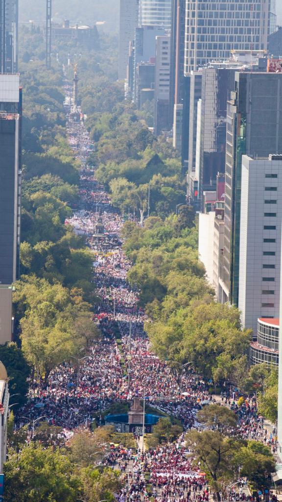 Por más de seis horas, la muchedumbre –que el gobierno de la Ciudad de México cifró en 1.2 millones de personas– se desparramó, con rumbo al Zócalo, por las calles de Madero, 5 de Mayo, Venustiano Carranza y Donceles. La Plaza de la Constitución ya estaba casi llena cuando el presidente avanzaba todavía por el cruce de Reforma e Insurgentes.