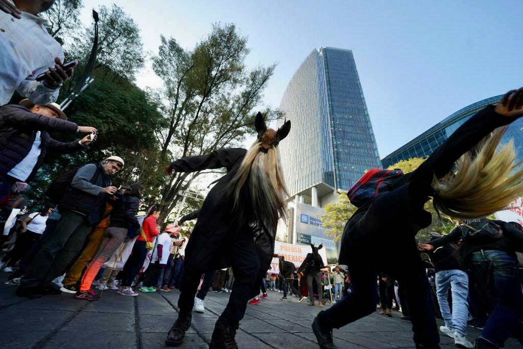 Delante y detrás de él, desfilan orgullosos contingentes de pueblos originarios de, prácticamente, todos los estados de la República: yaquis, purépechas, tzotziles, cuicatecos, mazahuas, nahuas, triquis, mixes, me’phaa, nu’saavi, nahuas… Una pancarta hoy responde a los insultos racistas y clasistas de la marcha derechista del 13 pasado: “los indios patas rajadas ya salimos a defender al presidente y a la patria”. El dibujo de un tigre que ruge ilustra la consigna.