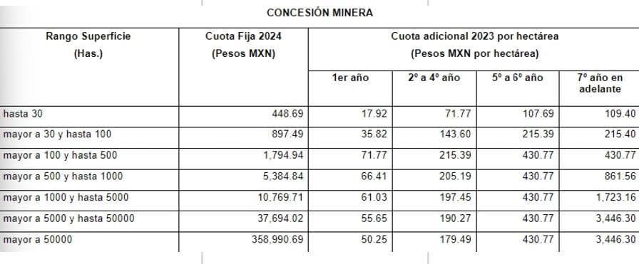 Además, los precios de las concesiones son muy bajos. De acuerdo con las cuotas publicadas el 26 de diciembre de 2023 en el Diario Oficial de la Federación, en el primer año de concesión, si se tiene un área de hasta 30 hectáreas, se paga solo 17.92 pesos por cada una, que sube hasta 109.40 pesos para las de siete años en adelante. Las concesiones de 100 hasta 500 hectáreas pagan 71.77 pesos por hectárea en el primer año, que puede ascender a 430.77 pesos a partir del año siete. Quien tenga una superficie concesionada de más de 50 mil hectáreas, deberá pagar, si es su primer año, 50.25 pesos por hectárea o 3 mil 446.30 pesos si lleva más de siete años.