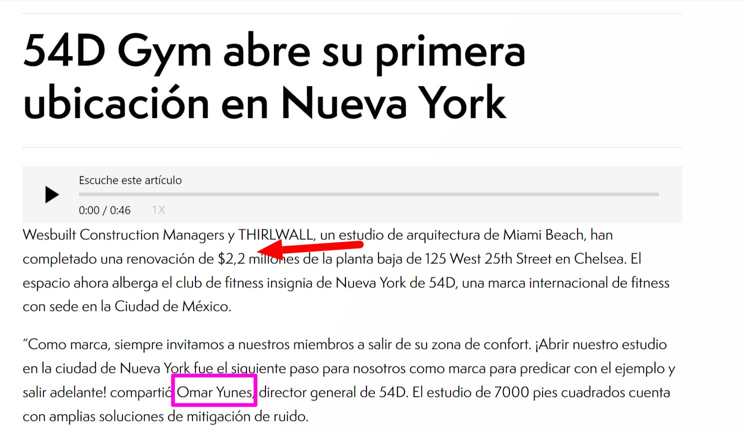 Finalmente, una sexta propiedad, también en la Gran Manzana, fue renovada y adaptada para abrir una sucursal más de un gimnasio del Clan Yunes. Sólo en la renovación, los Yunes gastaron 2.2 millones de dólares. La Franquicia de Gimnasios de la cual es CEO Omar Yunes lleva el nombre de 54 D y según su portal tiene sucursales en Miami, Nueva York, la Ciudad de México y Colombia.