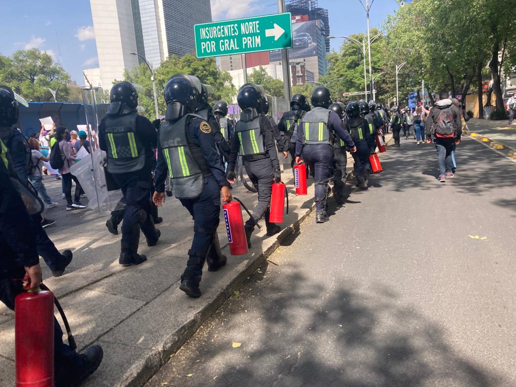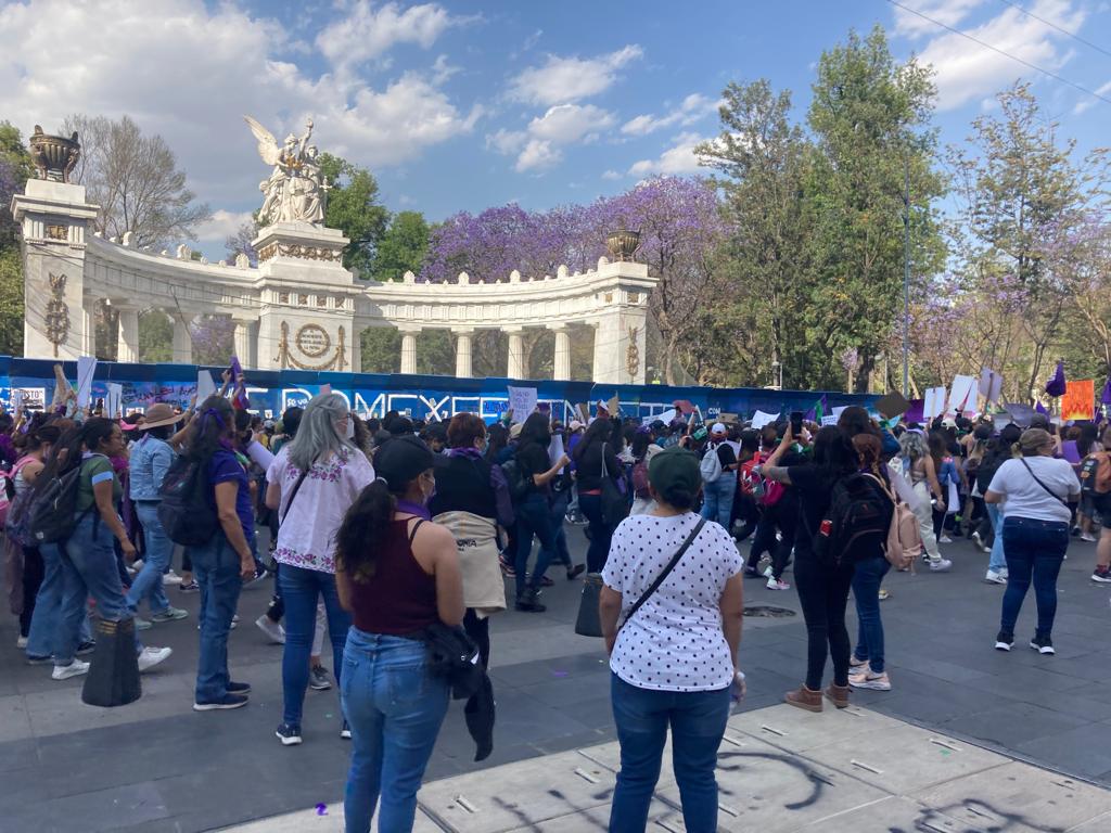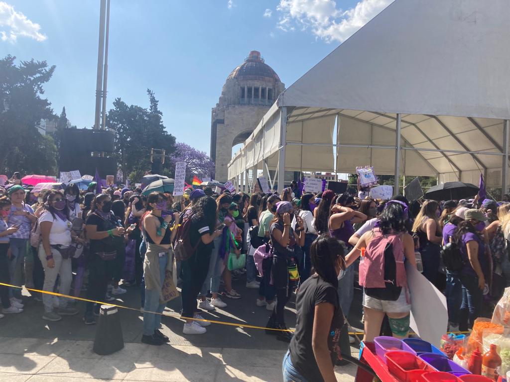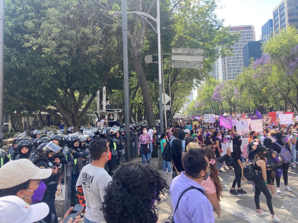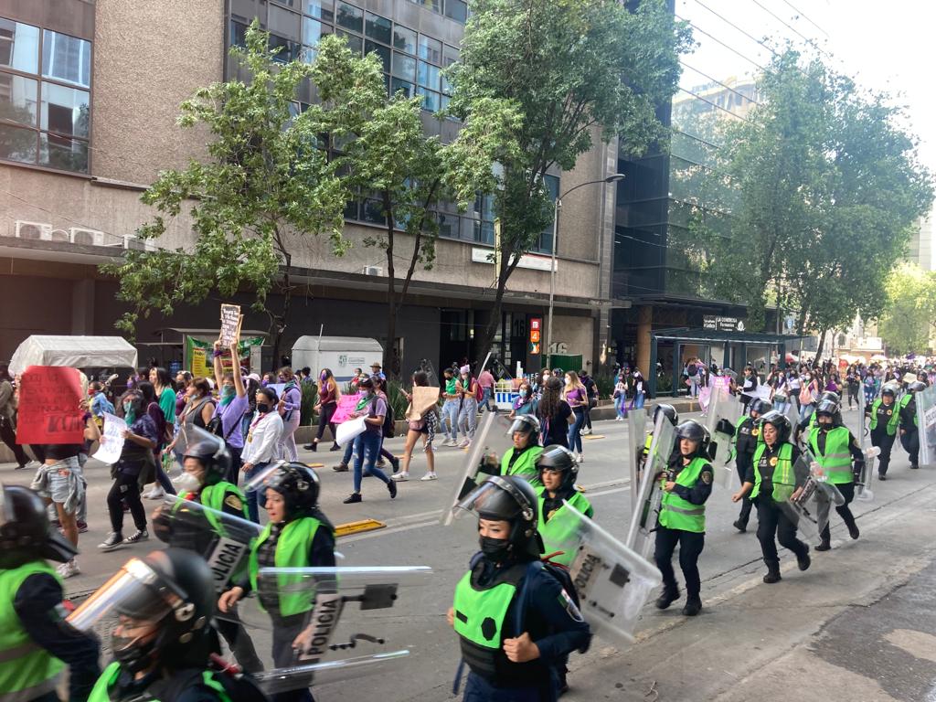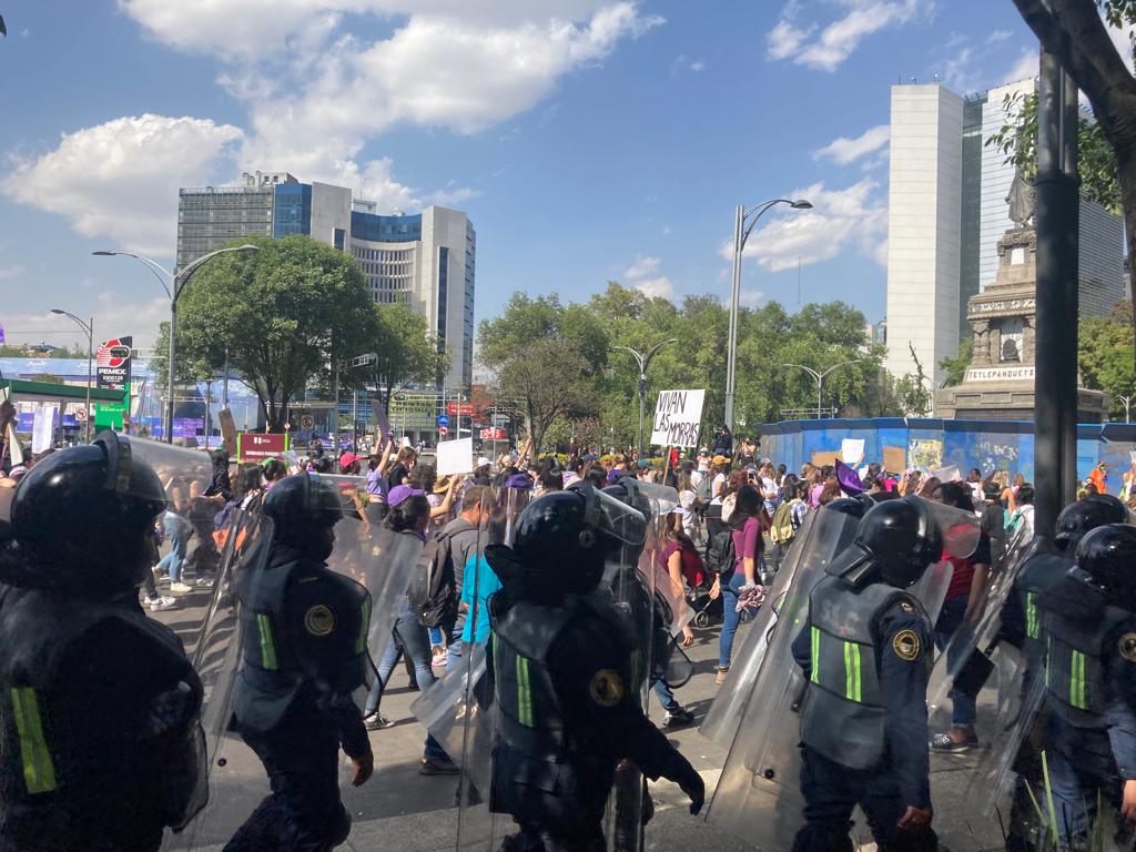 A la altura del Senado de la República, aproximadamente a las 15:10 horas, dos contingentes se encuentran: el procedente de la Ángela y el del monumento a la Revolución. Ambos vienen flanqueados por decenas de mujeres policías. Gritos y consignas suenan con mayor fuerza. Humos morados y verdes se alzan por los aires. Banderas violetas y verdes ondean sus consignas. Pancartas gritan dolores.