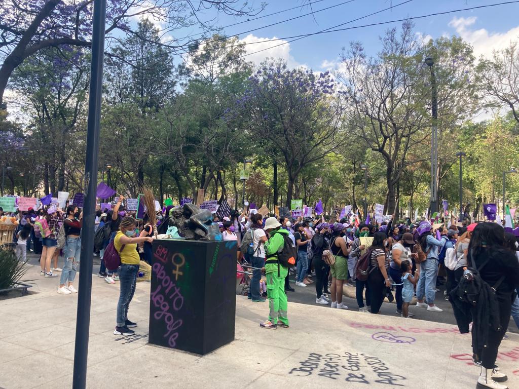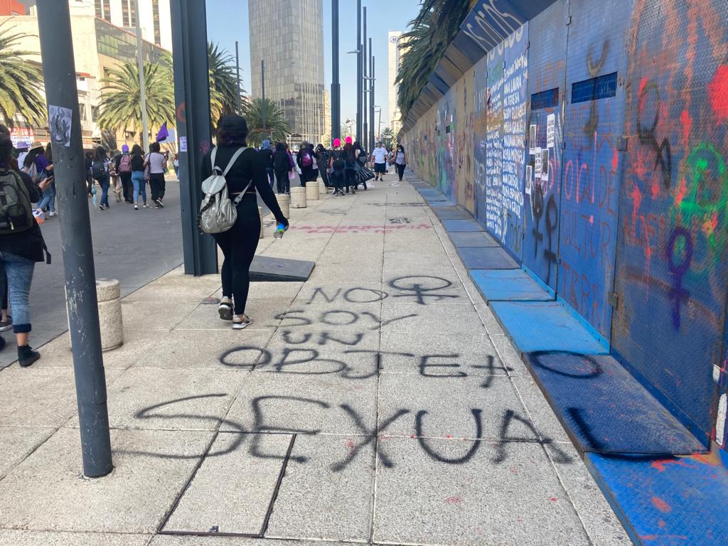 La marcha serpentea para llegar al monumento a la Revolución, desde donde se gritan más consignas. Vuelve a serpentear para llegar a la avenida Juárez: negocios, monumentos y el Palacio de Bellas Artes se aprecian detrás de las barreras de metal, para estos momentos ya cubiertas por graffitis. Estatuas, banquetas y paredes descubiertas son intervenidas una y otra vez: aerosoles van y vienen rayando frases, haciendo memoria: “Vivas nos queremos”, “Ni una menos”.