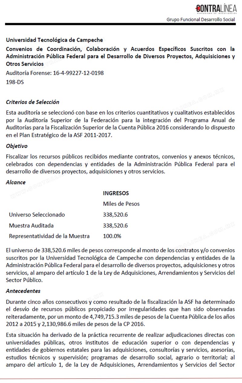 De las 11 instituciones de educación superior supuestamente implicadas en el esquema de la llamada “estafa maestra” sobresale la Universidad Tecnológica de Campeche, relacionada contractualmente con cinco instituciones federales: además del TEPJF y PEP, está la Sedatu, la SRE y el Imcine, revela la auditoría forense 198.