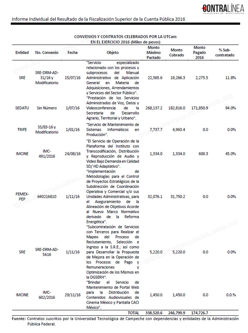Además, se mencionan convenios del Tribunal Electoral del Poder Judicial de la Federación (TEPJF) y la subsidiaria Pemex Exploración y Producción (PEP), con la salvedad de que por éstos la universidad involucrada –la Tecnológica de Campeche– no subcontrató empresas, sino personal bajo la modalidad de becarios y de sueldos y salarios.