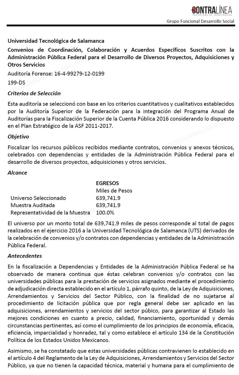 Para la Auditoría Superior, otra escuela superior con problemas sería la Tecnológica de Salamanca. Ésta obtuvo convenios con cinco instituciones federales (Sagarpa –dos–, CFE, Pronósticos, Conagua, Indesol) y una capitalina (Secretaría de Cultura), por 59 millones 449 mil pesos.