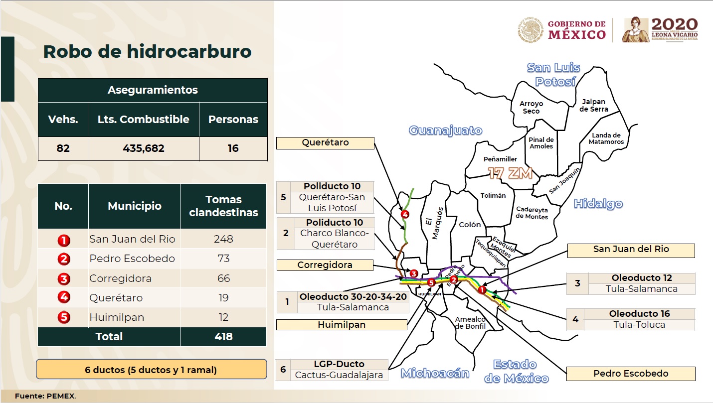 En Querétaro, las autoridades federales han decomisado 435 mil 682 litros de combustible robado entre diciembre de 2018 y lo que va de 2020, reveló esta mañana el secretario de la Defensa Nacional, Luis Cresencio Sandoval.
