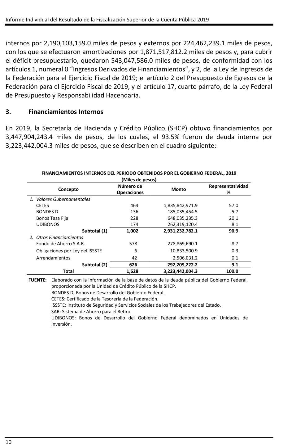 La Auditoría de Cumplimiento 2019-0-06100-19-0017-2020 indica que “las necesidades de financiamiento del gobierno federal para 2019 fueron de 2 billones 414 mil 565 millones 398 mil pesos, de los cuales 2 billones 190 mil 103 millones 159 mil pesos, el 90.7 por ciento, se obtuvieron mediante deuda interna y 224 mil 462 millones 239 mil pesos, el 9.3 por ciento, de deuda externa.