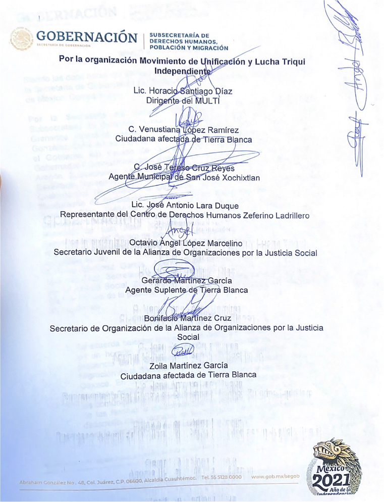 Horacio Santiago Díaz, integrante del Movimiento de Unificación y Lucha Triqui Independiente (MULTI); Venustiana López Ramírez y Zoila Martínez García, indígenas triquis desplazadas de Tierra Blanca Copala; José Tereso Cruz Reyes, Agente Municipal de San José Xochixtlan; José Antonio Lara Duque, representante del Centro de Derechos Humanos Zeferino Ladrillero; Octavio Ángel López Marcelino, secretario Juvenil de la Alianza de Organizaciones por la Justicia Social; Gerardo Martínez García, agente Suplente de Tierra Blanca; Bonifacio Martínez Cruz, secretario de Organización de la Alianza de Organizaciones por la Justicia Social.