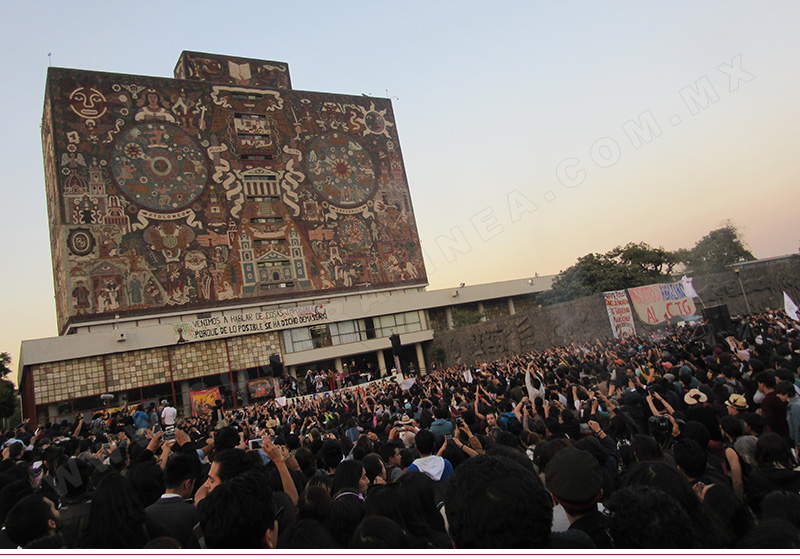 En el discurso que Marichuy leyó frente a la Biblioteca Central, se reivindicó al activista Carlos Sinhué Cuevas Mejía, estudiante activista asesinado en 2011, y a los demás alumnos perseguidos, agredidos y ultimados.