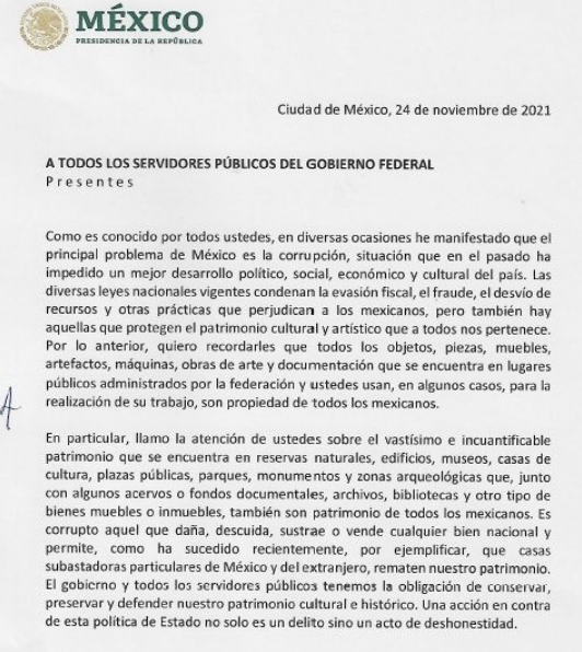 López Obrador se ha comprometido en su carta a que publicará un decreto en el que se especifiquen los ordenamientos jurídicos que se violan cuando se actúa de manera deshonesta en el manejo de los bienes de la nación. Y finaliza la misiva con un exhorto, que no debe limitarse a los empleados federales, sino que debe ser extensivo a toda la población: “los invito a cuidar y proteger el legado de milenios que nos han dejado nuestros predecesores y a hacer conciencia del valor y riqueza de cada pieza, por más pequeña que parezca, que tiene para seguir mostrando al país y a otras naciones la grandeza de México”.