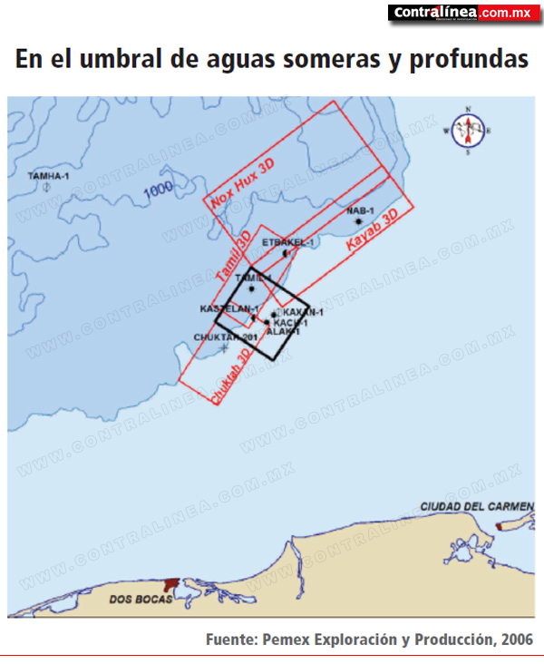 Como señala la información oficial, el bloque y los campos cercanos se ubican en aguas “someras”, pero es preciso matizar que son “someras” en la clasificación mexicana, porque el bloque y los tres campos se encuentran en aguas más profundas que las tradicionales; son áreas nuevas a donde se ha extendido la búsqueda de hidrocarburos en la nueva etapa de agotamiento de los campos viejos.