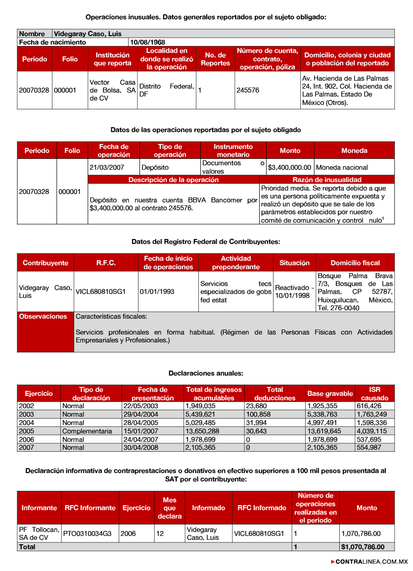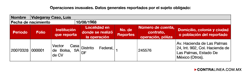 Este nuevo “villano favorito” de algunos testigos colaboradores –como la exsecretaria Rosario Robles Berlanga, presa por participar en la maquinación de la llamada “estafa maestra” y desviar recursos públicos de las secretarías de Desarrollo Social y de Desarrollo Agrario, Urbano y Territorial, dinero que debió destinarse a los mexicanos más pobres de todo el país– fue reportado por la UIF desde 2009 por un depósito de 3 millones 400 mil pesos que hizo en Vector Casa de Bolsa, “operación que se sale de los parámetros establecidos por el comité de comunicación y control de dicha institución”.
