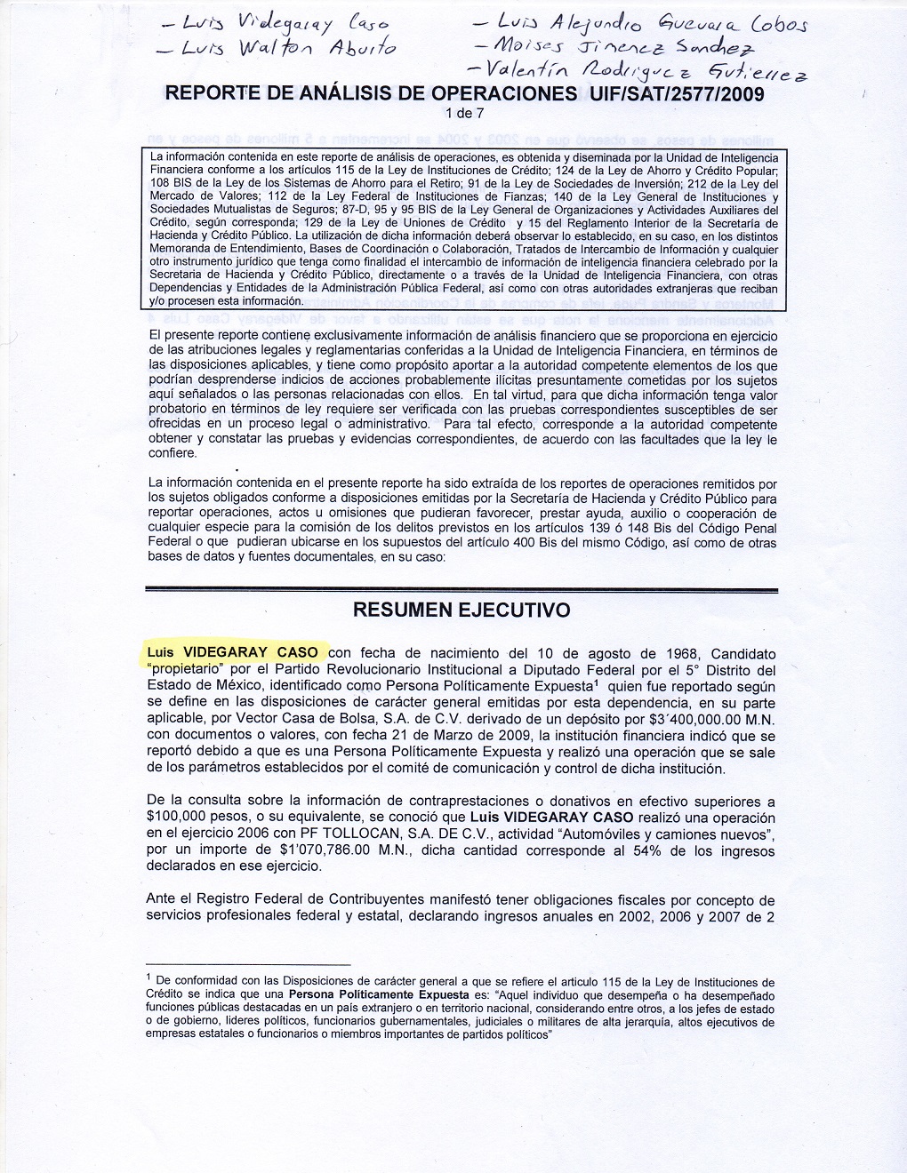 Dicho reporte elaborado por la UIF con información del Servicio de Administración Tributaria (SAT), precisa que de la consulta sobre la información de contraprestaciones o donativos en efectivo superiores a 100 mil pesos o su equivalente, se conoció que Videgaray Caso realizó una operación en el ejercicio 2006 que llamó la atención de las autoridades, con la distribuidora de automóviles PF Tollocan, SA de CV, por un importe de 1 millón 70 mil 786 pesos, cantidad que corresponde al 54 por ciento de los ingresos declarados en ese ejercicio por el entonces secretario de Finanzas del gobierno mexiquense.