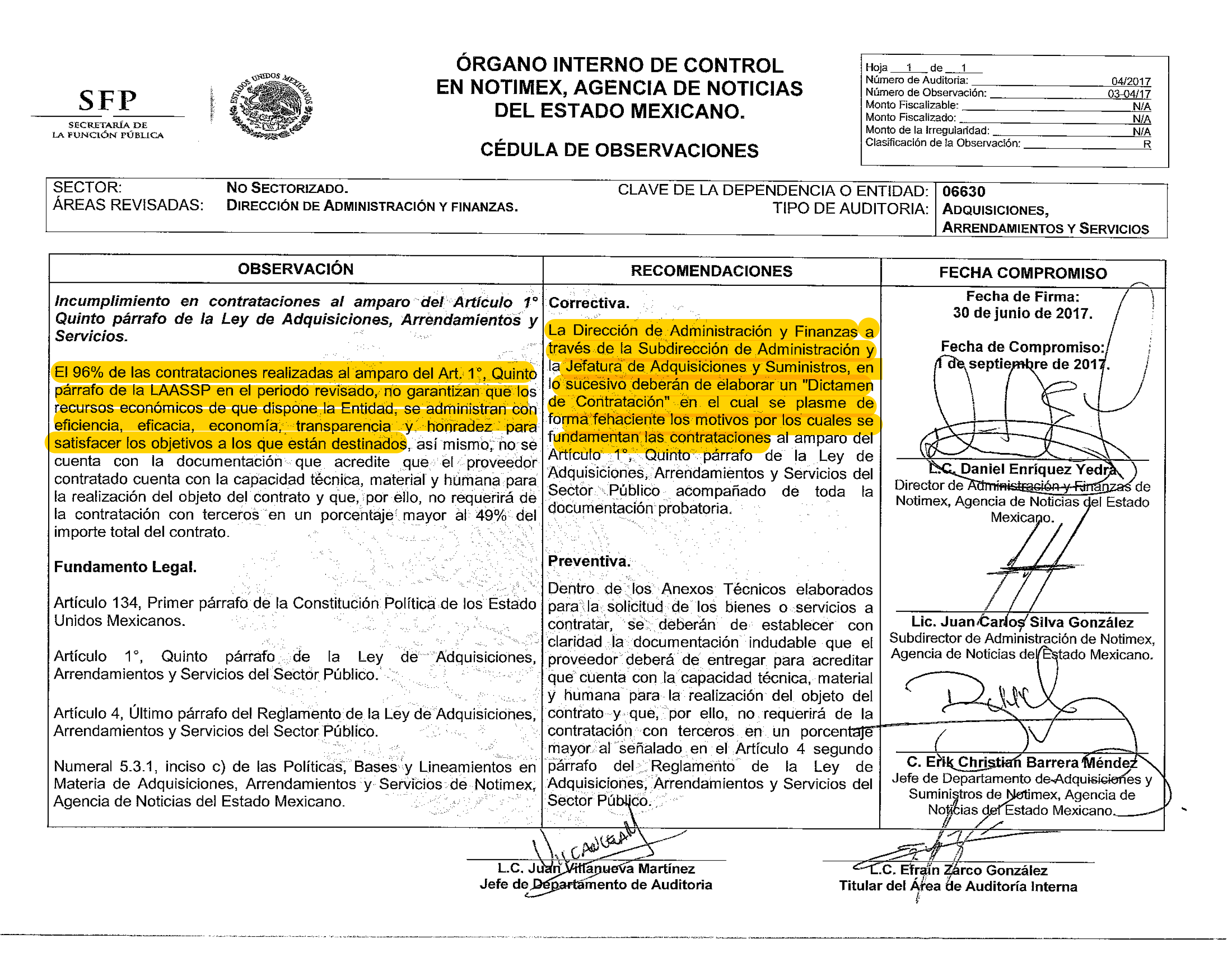 Ejemplo de ello es lo expuesto por la auditoría 04/2017 –del 30 de junio de 2017–: “el 96 por ciento de las contrataciones realizadas al amparo del artículo 1, quinto párrafo de la Ley de Adquisiciones, Arrendamientos y Servicios en el periodo revisado no garantizan que los recursos económicos de que dispone la entidad se administran con eficiencia, eficacia, economía, transparencia y honradez para satisfacer los objetivos a los que están destinados”.