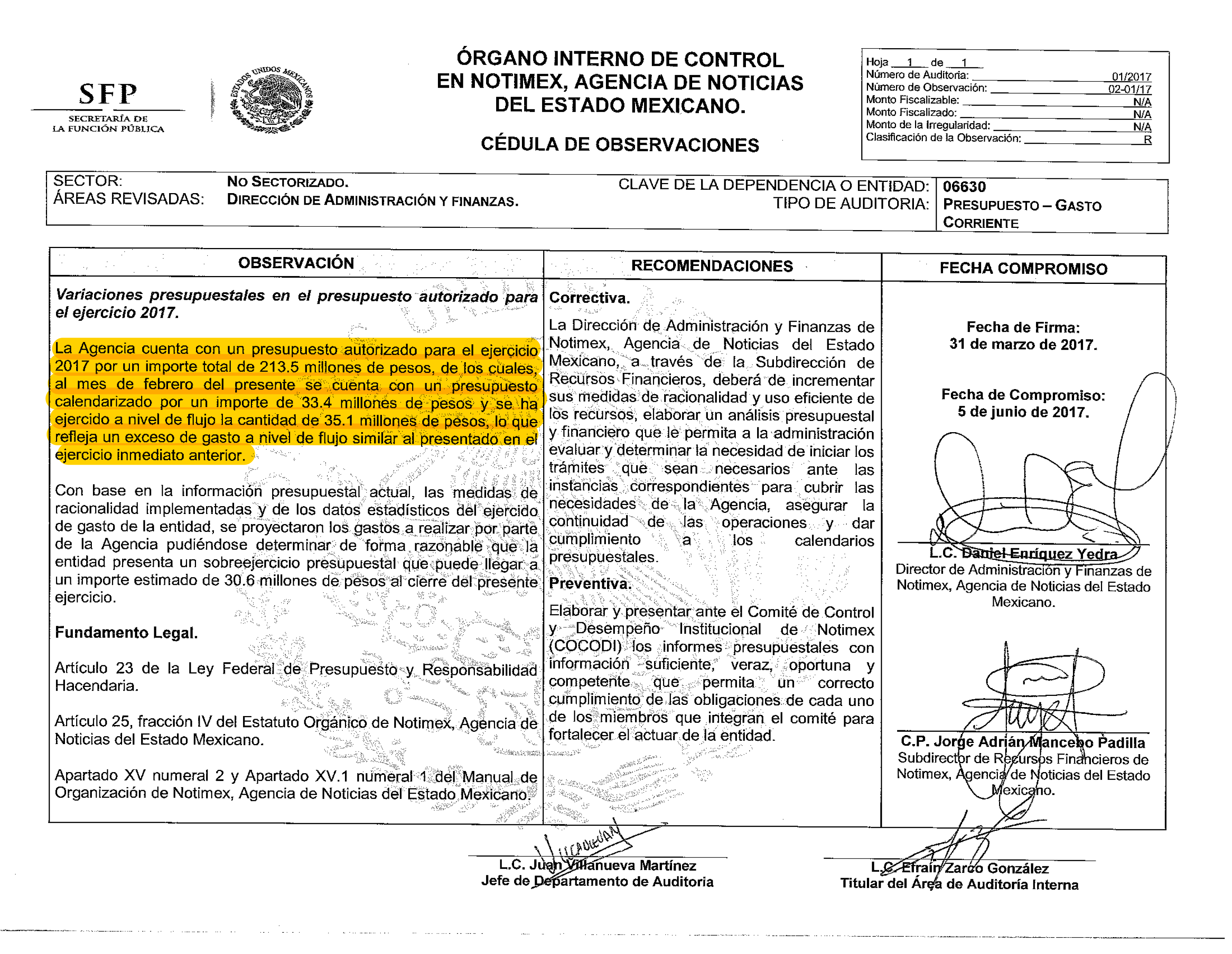 En esa misma revisión, el Órgano Interno de Control observó que en el ejercicio 2017, Notimex –se gastó entre enero y marzo– el 99.97 por ciento de su presupuesto autorizado para todo el año.