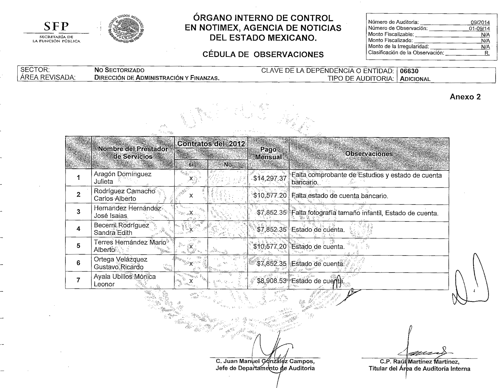 De éstas se investigaron desde las cuentas bancarias hasta las documentaciones que obran en los archivos de Notimex sobre su relación laboral o contractual, así como comprobaciones de todo tipo, en especial aquellas relaciones con supuestos beneficios indebidos (como viajes y gastos personales con cargo al erario).