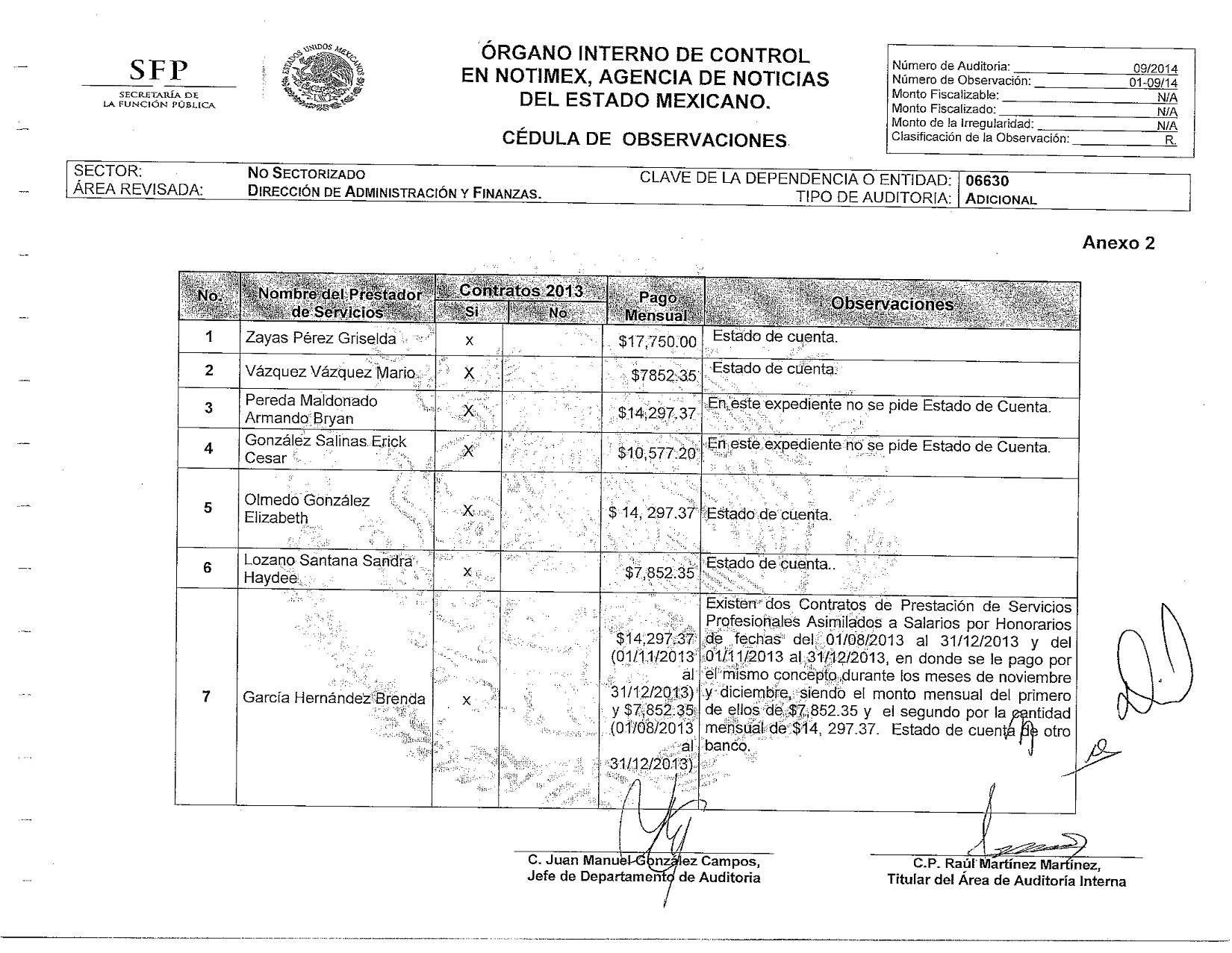 El informe agrega que el otro pago era por cantidad de 4 mil 968 dólares mensuales, del que se le retiene el 25 por ciento de impuesto, por 1 mil 242 dólares; resultando el importe neto de 3 mil 726 dólares mensuales, más los otros 2 mil dólares. “Además se deben agregar 842 dólares por concepto de seguridad social que Notimex paga por esta persona.