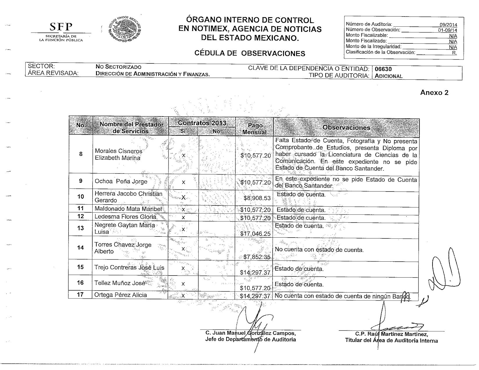 Otra anomalía corresponde a la contabilización incorrecta de los sueldos de los empleados de las oficinas regionales de Madrid, España; y Santiago de Chile. Al respecto, abundaba que en la oficina regional de Madrid se encontraba laborando la C. María Blanca Sáez Lasheras como secretaria y asistente de la coordinación regional para Europa, con un sueldo mensual de 1 mil 704.76 euros, del que se le descontaban las deducciones de ley (seguridad social e impuestos), percibiendo un sueldo neto de 1 mil 356.84 euros mensuales. Los antecedentes laborales de esta persona en Notimex, es un contrato como trabajador eventual de fecha 23 de julio de 1998, firmado entre la trabajadora y Notimex, SA de CV; posteriormente, el 22 de enero de 1999, dicho contrato es declarado indefinido de acuerdo con el oficio del Ministerio de Trabajo y Seguridad Social (Instituto Nacional de Empleo) de España. No obstante lo anterior, el trámite generado para la solicitud de los recursos para el pago de este sueldo señala el concepto de honorarios y se contabiliza en la cuenta 5133 Servicios Profesionales, subcuenta 33104 otras asesorías.