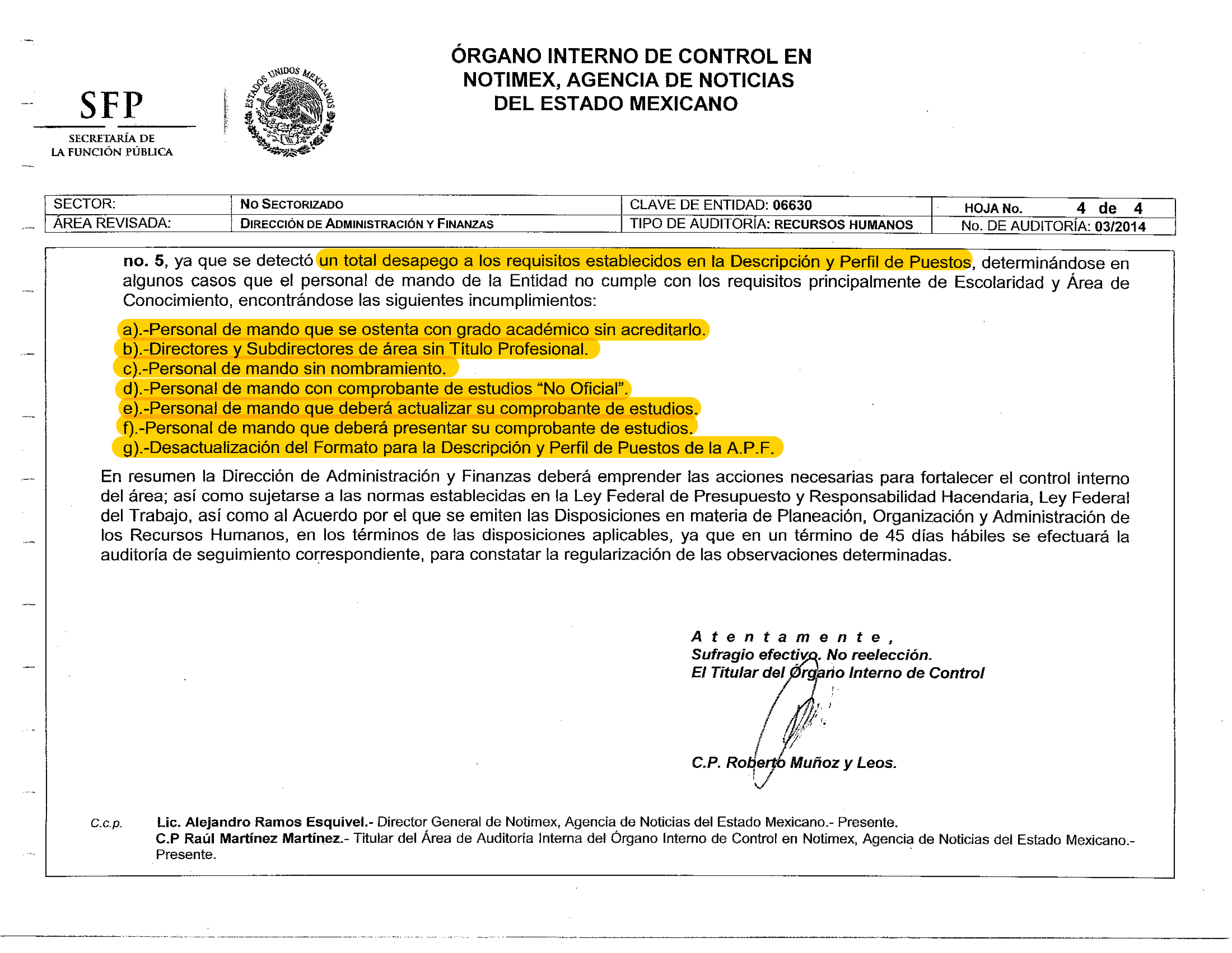 “a) Personal de mando que se ostenta con grado académico sin acreditarlo; b) directores y subdirectores de área sin título profesional; c) personal de mando sin nombramiento; d) personal de mando con comprobante de estudios ‘No Oficial’; e) personal de mando que deberá actualizar su comprobante de estudios; f) personal de mando que deberá presentar su comprobante de estudios; g) desactualización del formato para la descripción y perfil de puestos de la administración pública federal.”