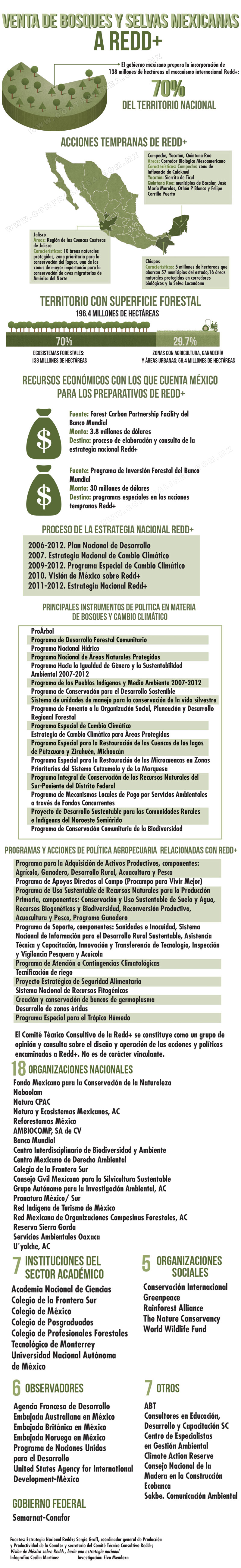 El gobierno mexicano prepara la incorporación de 138 millones de hectáreas (el 70 por ciento del territorio nacional) al mecanismo internacional Redd+. Aunque la estrategia se encuentra aún en la etapa de discusión y formalmente se someterá a consulta hasta 2014, el país ya recibió 33.8 millones de dólares de dos fondos del Banco Mundial: el Forest Carbon Partnership Facility y el Programa de Inversión Forestal. Con ello, se comprometió a concluir la estrategia y a avanzar por 5 años en las “acciones tempranas” de la Redd+. La Conafor, encargada de la ejecución del proyecto, celebra la “vocación” de todas las áreas naturales protegidas y reservas naturales mexicanas para incorporarse al mecanismo. Asegura que nada se impondrá a las comunidades, pues se realizarán consultas y los campesinos recibirán recursos económicos. Se prepara la usurpación de territorios más grande de todos los tiempos, considera Red Indígena