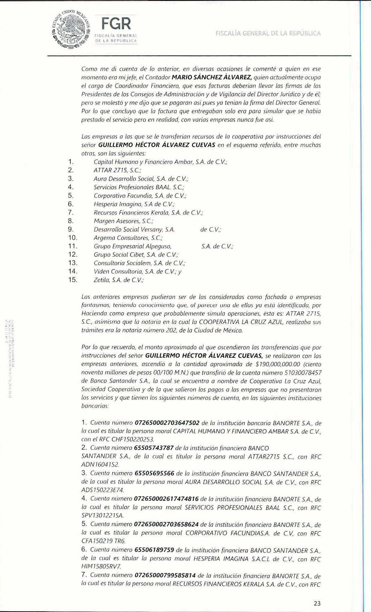 “Por lo que recuerdo, el monto aproximado al que ascendieron las transferencias que por instrucciones del señor Guillermo Héctor Álvarez Cuevas se realizaron con las empresas anteriores, ascendió a la cantidad aproximada de 190,000,000.00 (ciento noventa millones de pesos 00/100 MN) que transfirió de la cuenta número 51030078457 de Banco Santander, la cual se encuentra a nombre de Cooperativa La Cruz Azul, Sociedad Cooperativa, y de la que salieron los pagos a las empresas que no presentaron los servicios […]”.