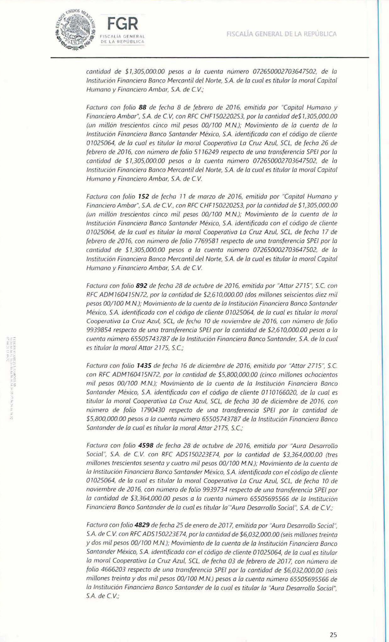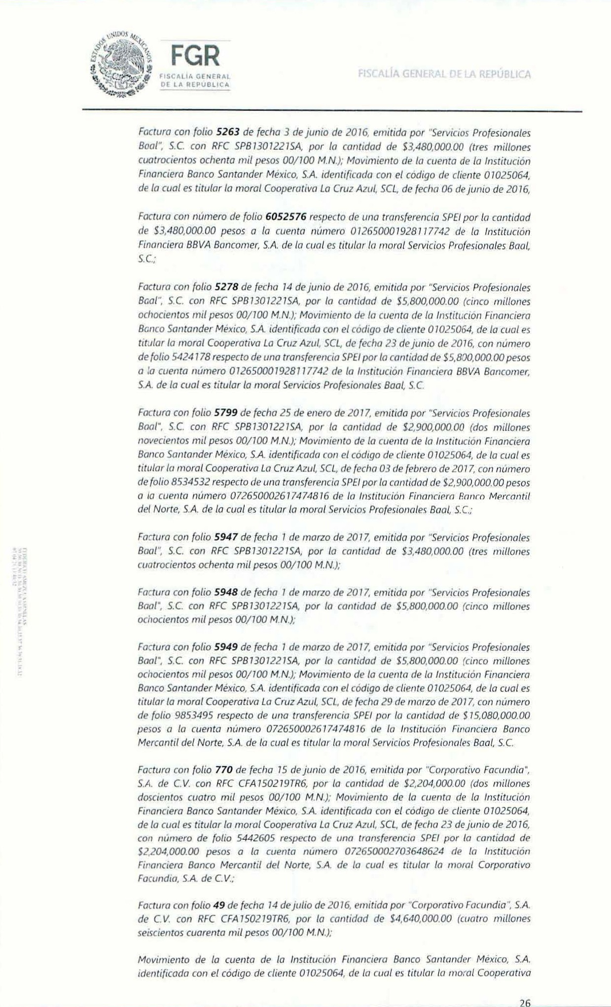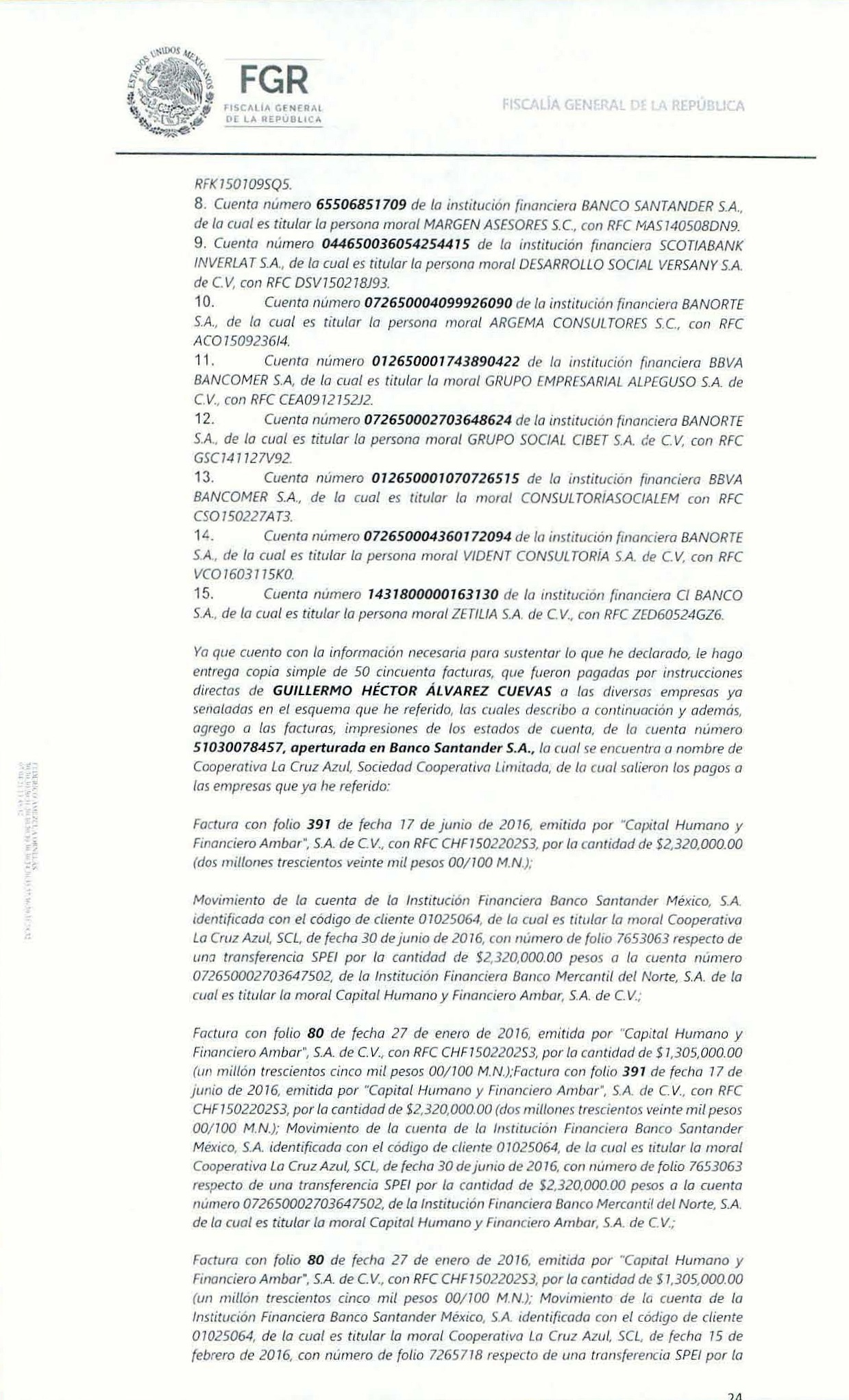 “Cuento con la información necesaria para sustentar lo que he declarado: le hago entrega en copia simple de 50 (cincuenta) facturas que fueron pagadas por instrucciones directas de Guillermo Héctor Álvarez Cuevas a las diversas empresas ya señaladas en el esquema que he referido, las cuales describo a continuación y, además, agrego a las facturas impresiones de los estados de cuenta, de la cuenta número 51030078457, aperturada en Banco Santander, SA, la cual se encuentra a nombre de Cooperativa La Cruz Azul, Sociedad Cooperativa Limitada, de la cual salieron los pagos a las empresas que ya he referido.”
